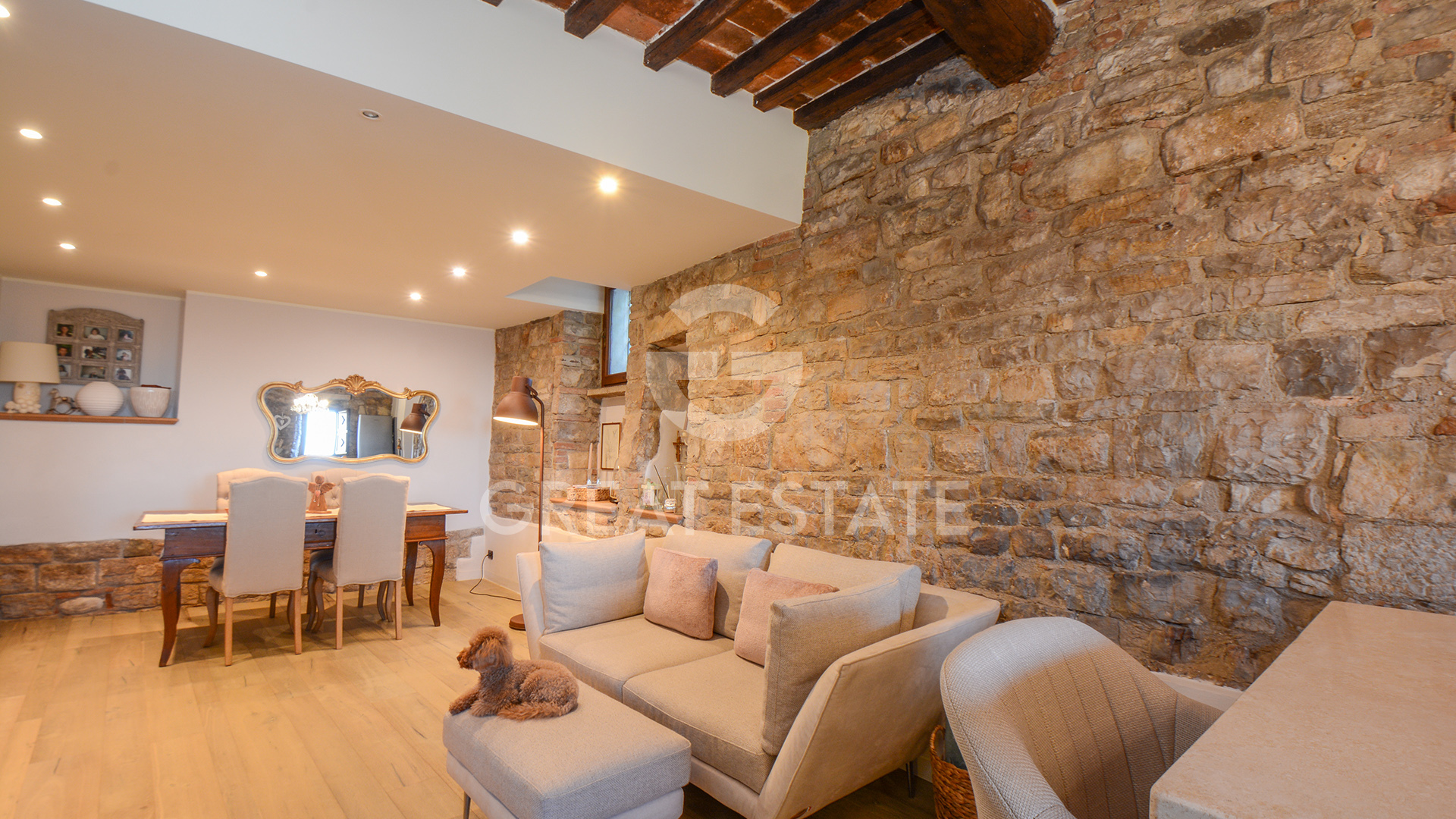 Spanning three levels and approximately 210 sqm, it features bright living spaces adorned with exposed wooden beams, stone walls, and high-end finishes.