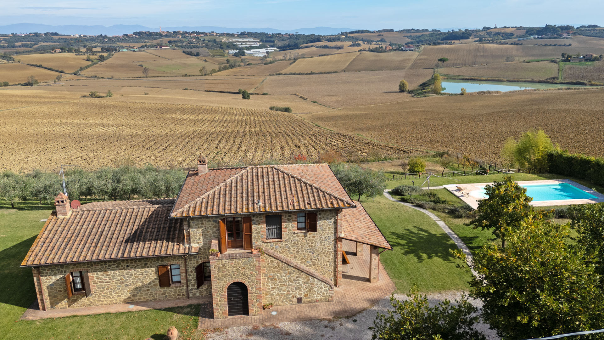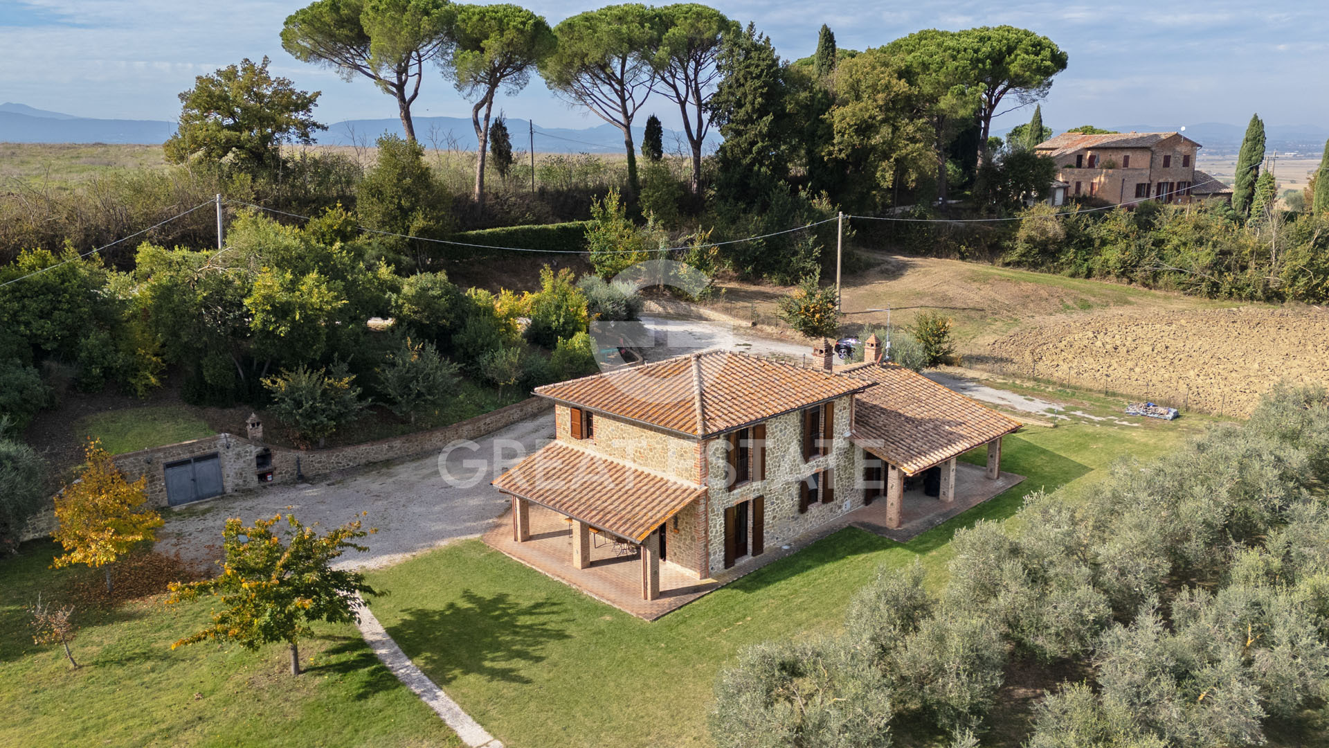In a splendid panoramic setting, surrounded by the peace of the countryside, stands this elegant stone farmhouse, built from scratch in 2007 with high-quality materials and meticulous attention to architectural details inspired by the local tradition.