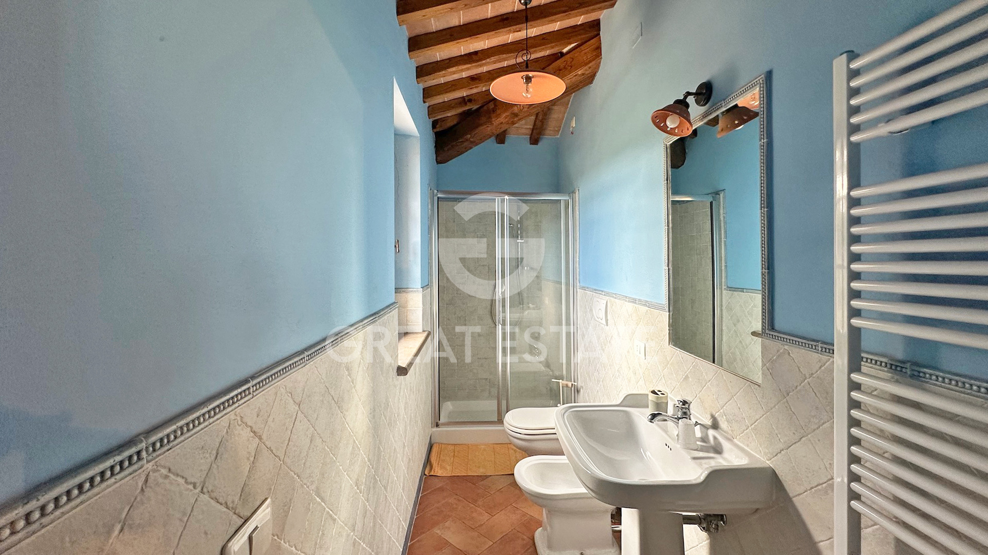 Built with an earthquake-resistant reinforced concrete structure and clad in local stone, the farmhouse is enriched with a mix of old and new roof tiles, Pienza terracotta floors, and chestnut beams. Every detail reflects the quality of the materials and a passion for authenticity.