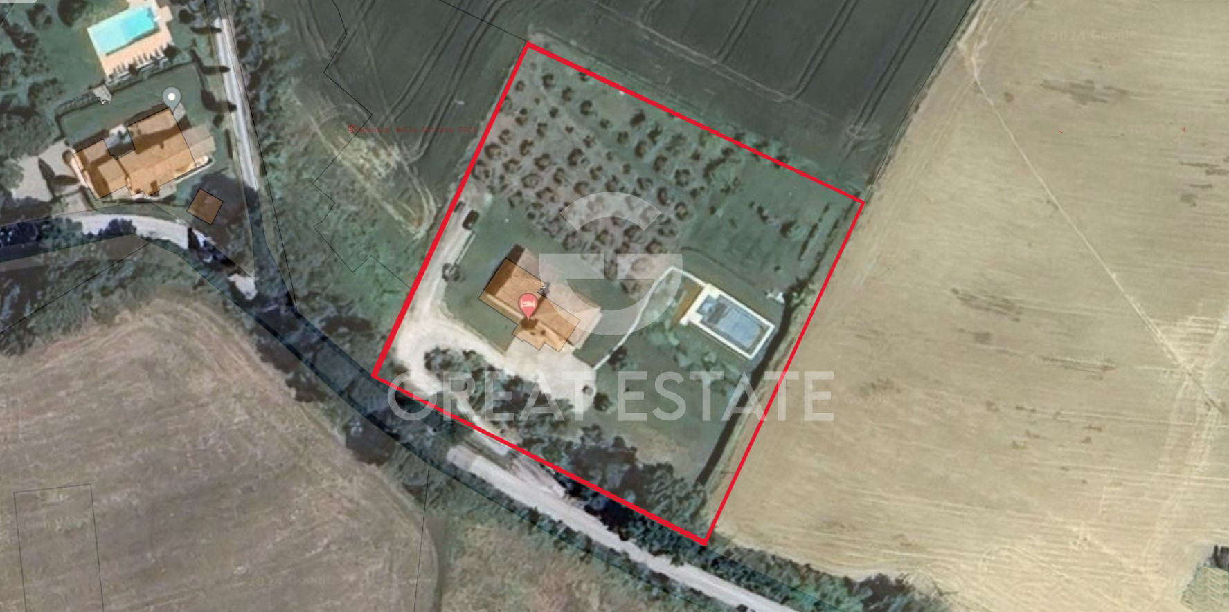 The property is completed by a beautifully maintained garden of approximately 6,500 sqm with 70 olive trees and various fruit trees, and a 6×12 m swimming pool.