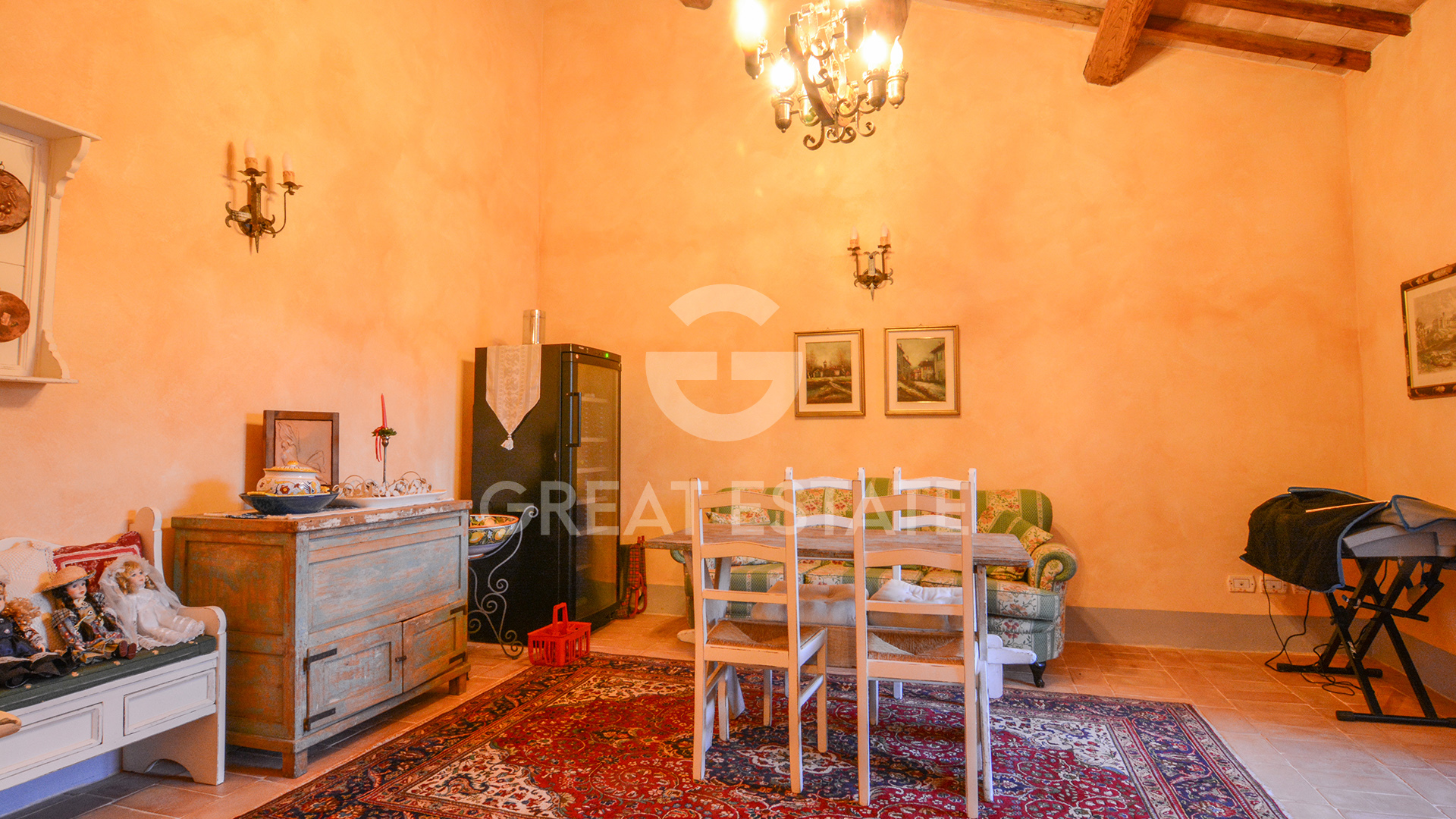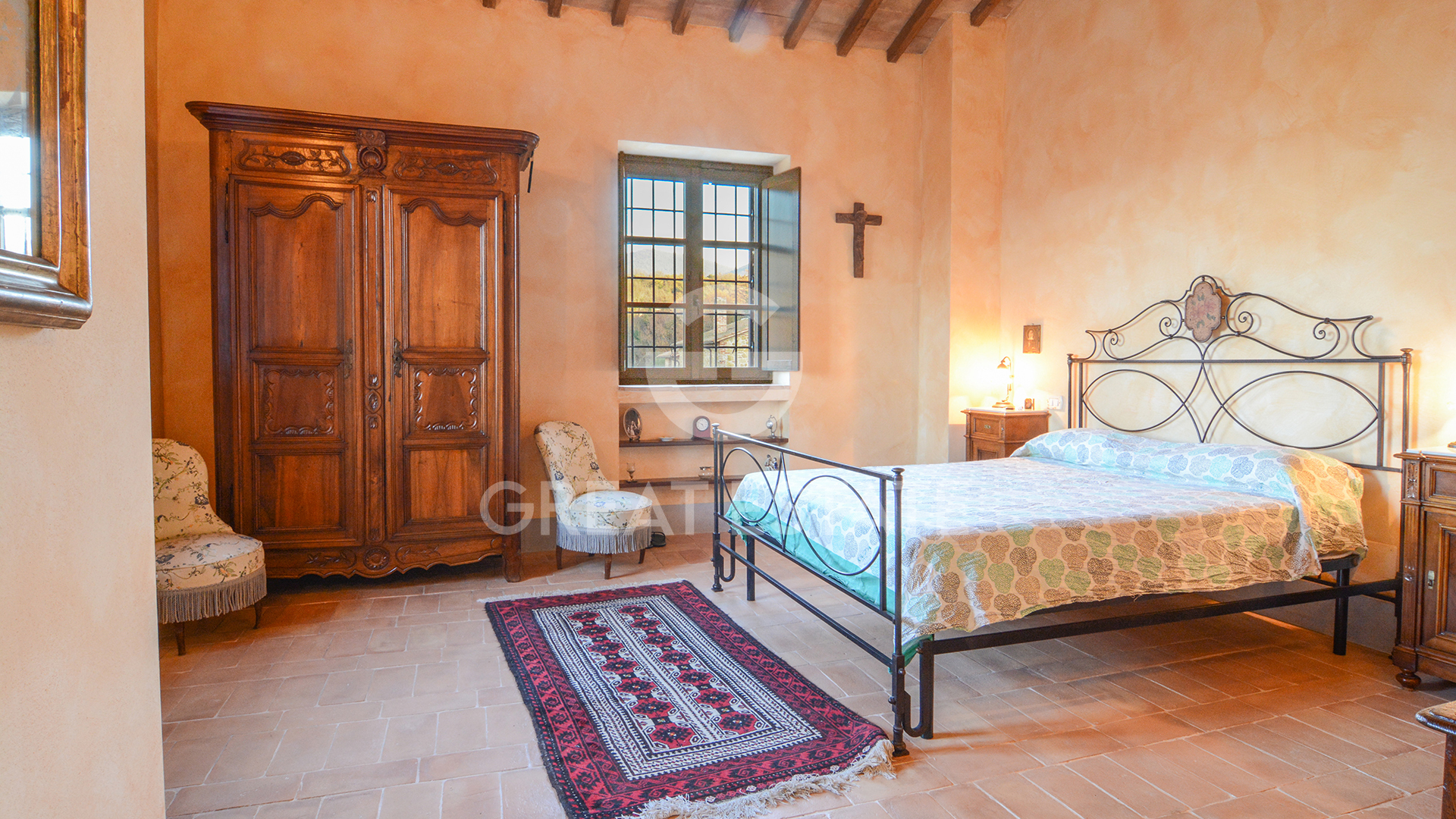 Traditional Umbrian finishes: wooden beams, terracotta tiles, and brick flooring. Convenient access from a public road with a motorized gate.