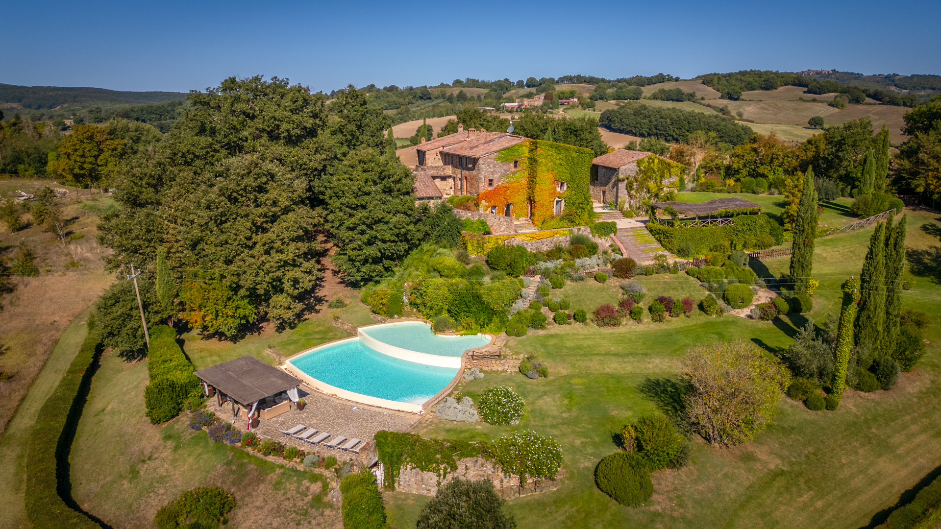 In a panoramic position amidst the Tuscan hills, just a short distance from a medieval village, a stunning estate is for sale, comprising a main villa of approximately 630 sqm and a 290 sqm guesthouse, both exquisitely renovated. The villa spans three levels and features spacious living areas with fireplaces, a kitchen with barbecue, six en-suite bedrooms, and a panoramic relaxation area. The guesthouse includes a living room, kitchen, and two double bedrooms with en-suite bathrooms. Outdoors, the property boasts a manicured garden, wood-fired oven, barbecue area, and a striking double panoramic swimming pool. This estate is ideal as a prestigious private residence or a luxury hospitality venue.