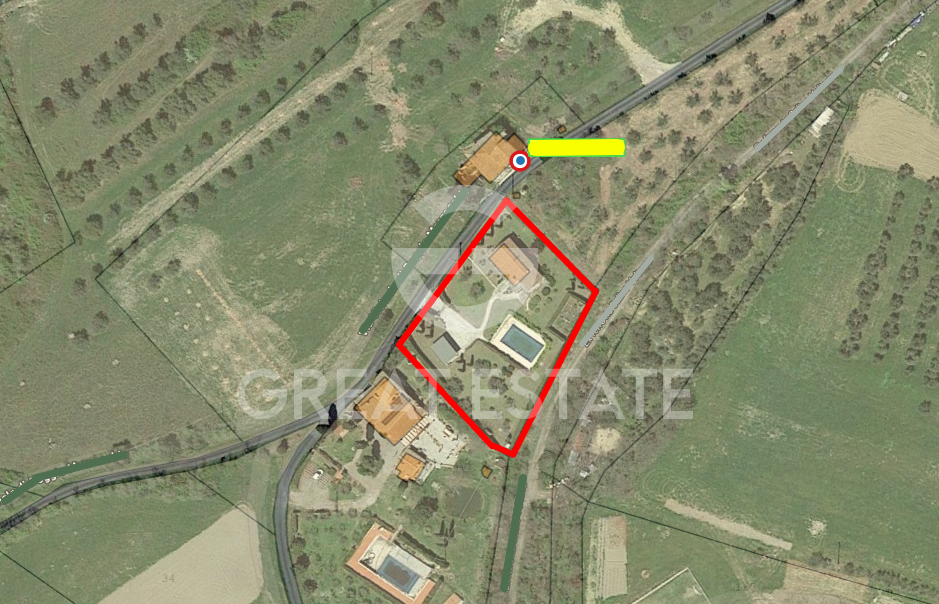 The exterior of the property is equally charming: adjacent to the house is a 10 x 5 meter infinity pool, accessible via a characteristic stone staircase and English-style lawn. The land, measuring 2285 square meters, is fully fenced with an iron gate at the entrance. There is also a wooden carport for cars.