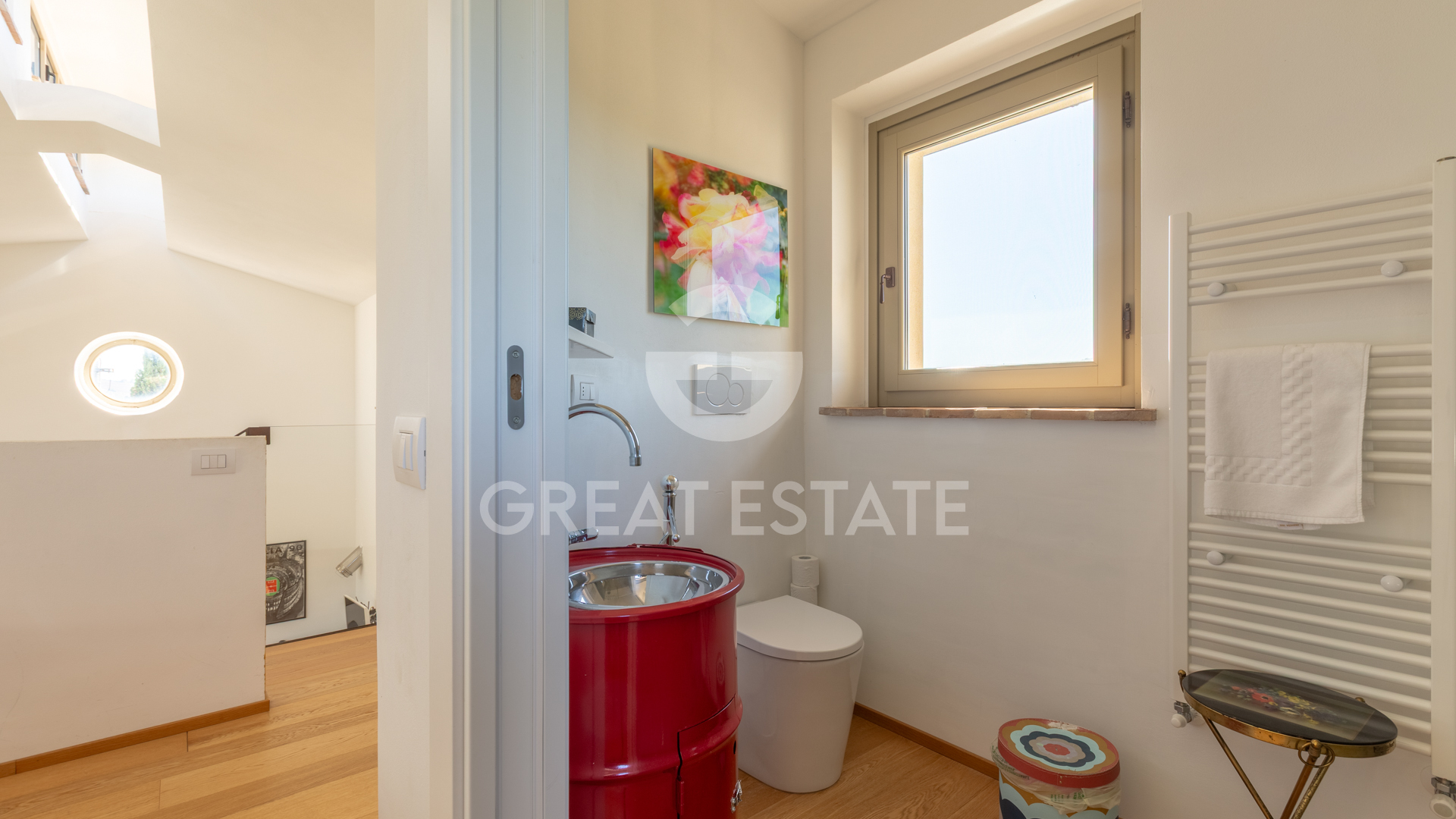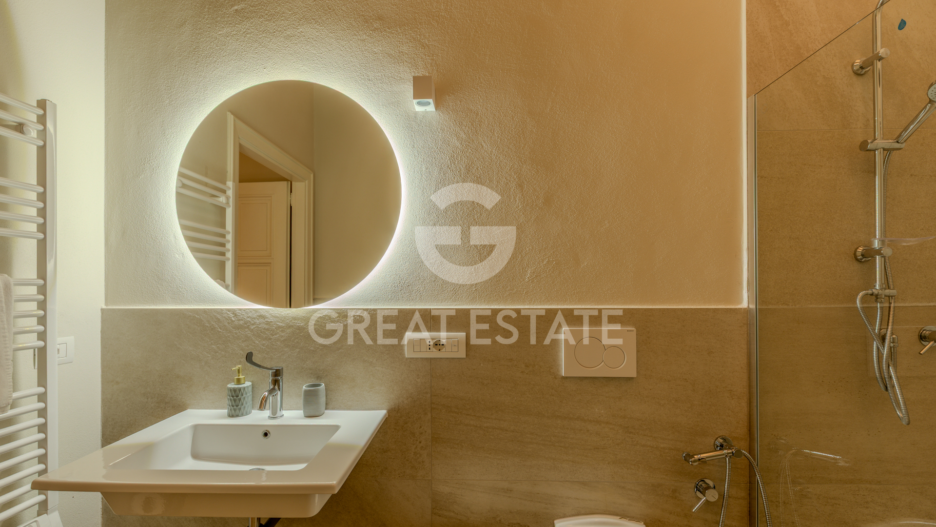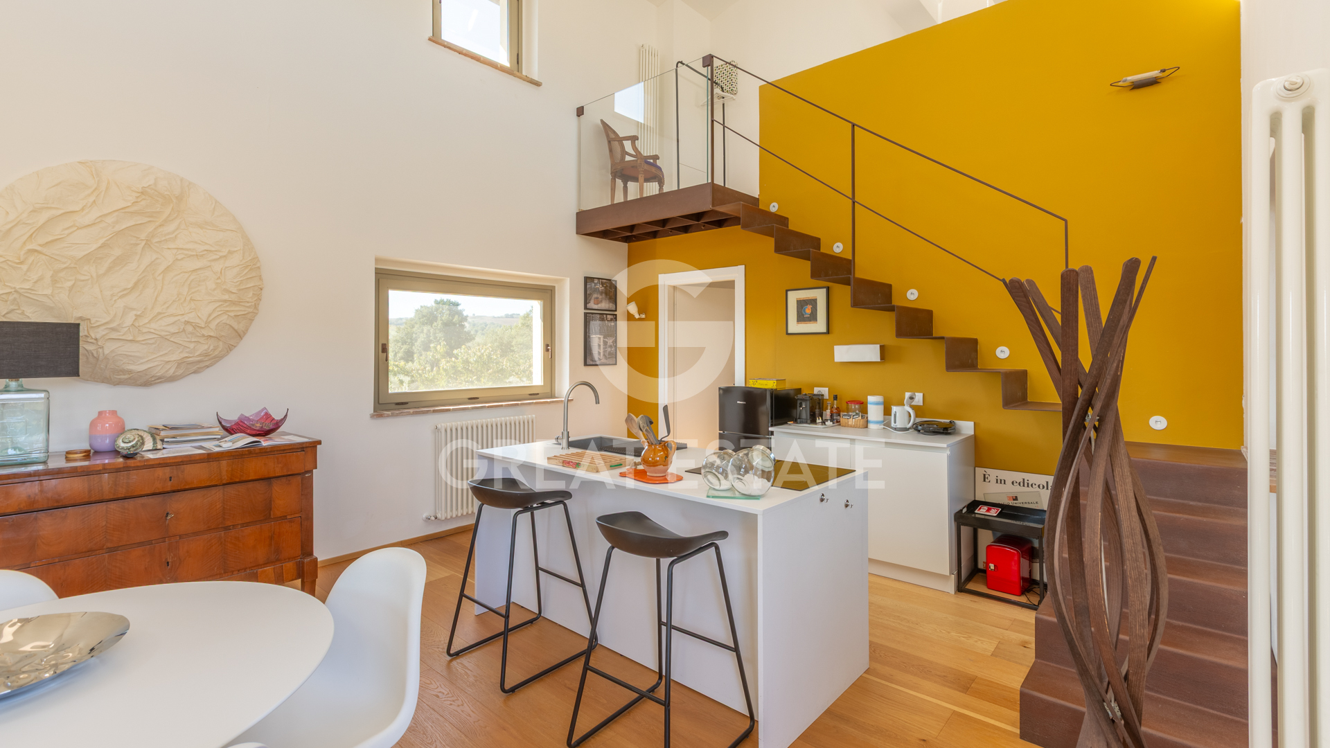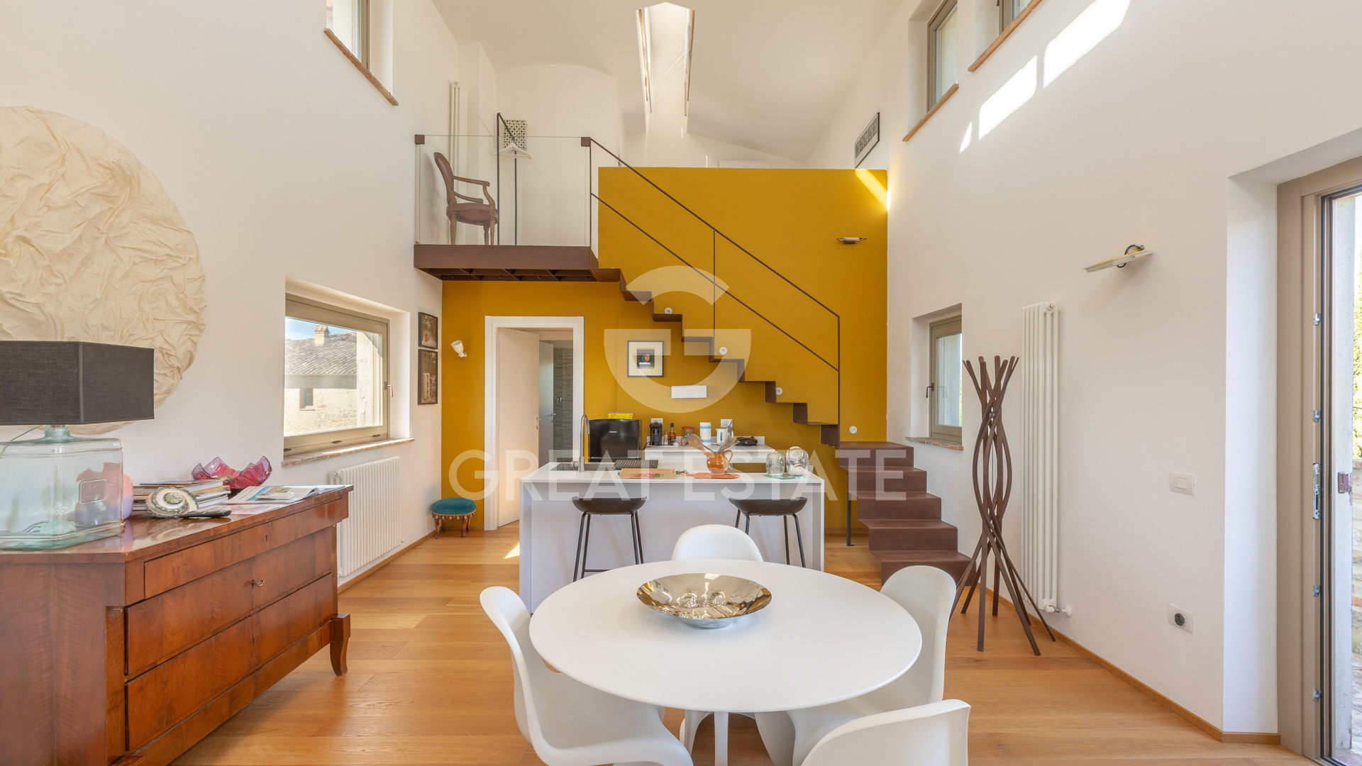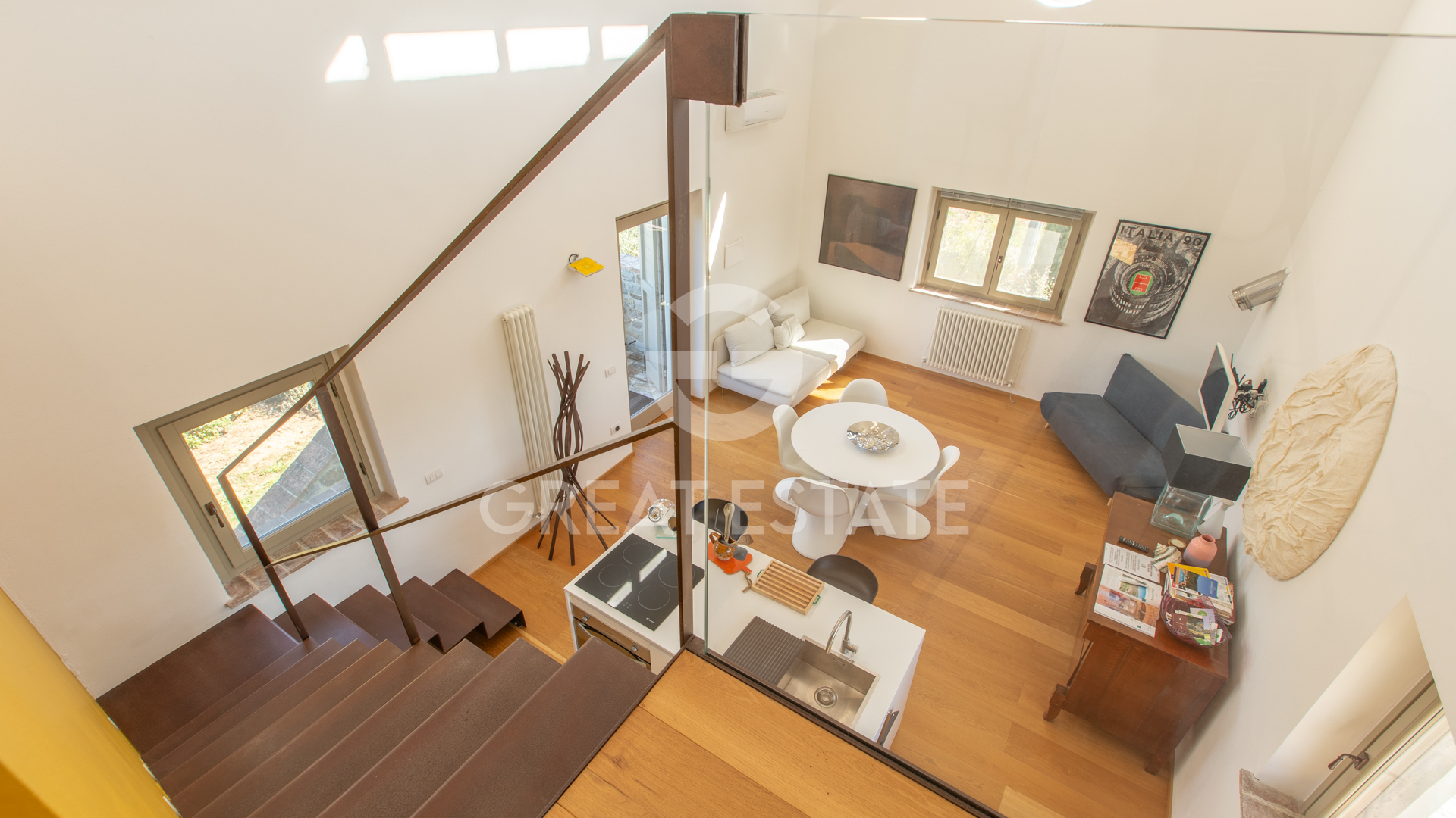The former Drying House, the result of excellent design work, spread over three floors, features on the ground floor an independent apartment comprising a spacious living room with kitchenette, a double bedroom and a bathroom. An external staircase leads to the first floor where the true loft unfolds: it welcomes us with a large living room/kitchen area and a stunning open staircase that draws the eye up to the roof of the drying house; a bedroom and a bathroom are also located on this floor, as well as on the top floor, which offers a magnificent view over the garden and the surrounding countryside.