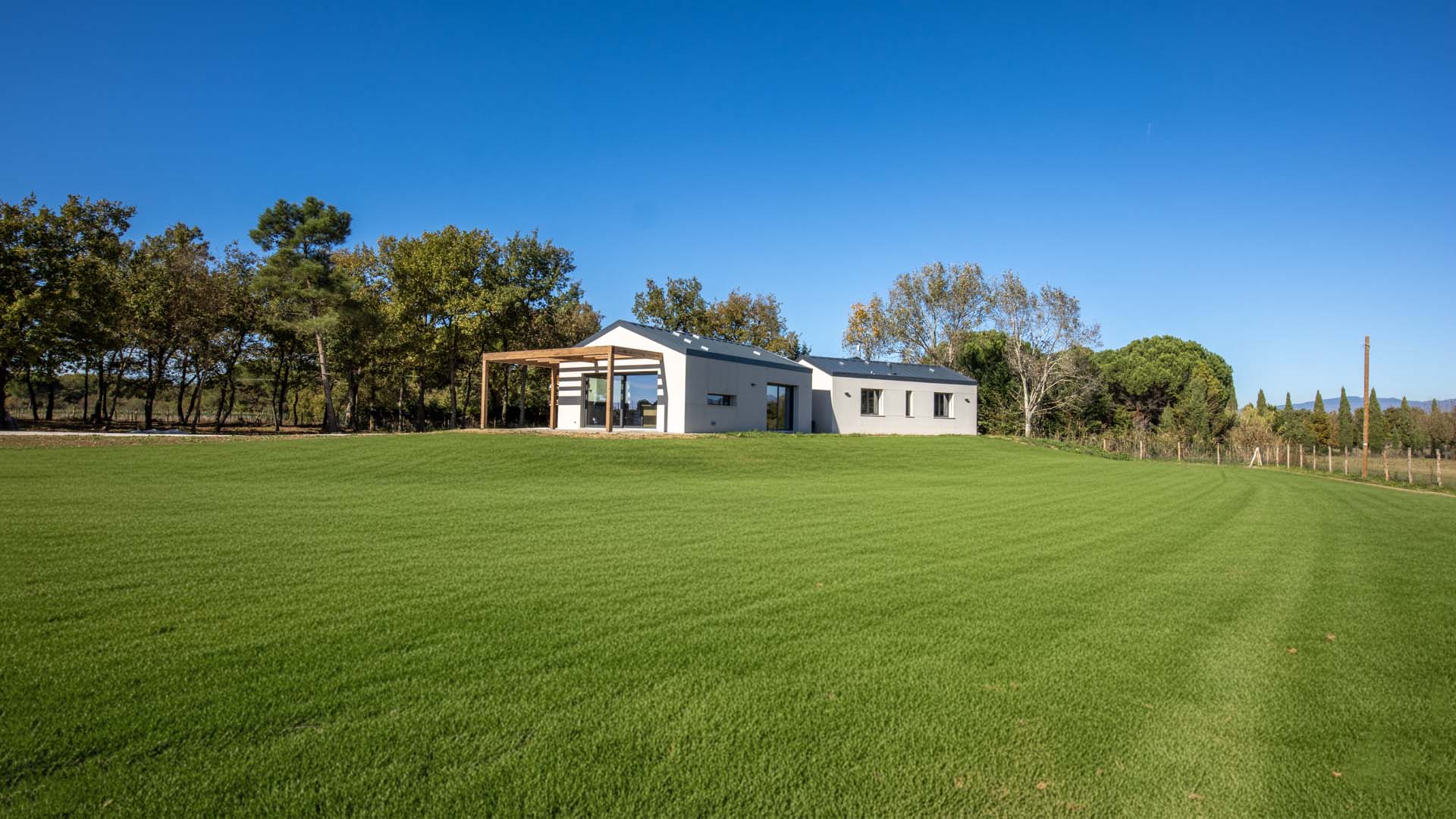 The perfectly flat garden expands the possibilities for outdoor living in total relaxation, enhanced by a forest of large oak trees, providing a perfect refuge during the warmer months.