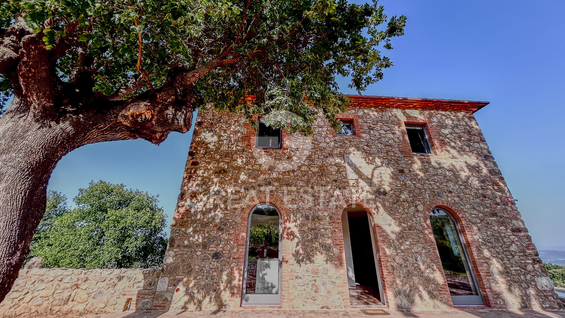 The farmhouse, approximately 250 sqm, has undergone meticulous restoration with particular attention to energy efficiency, achieving an A4 energy class.