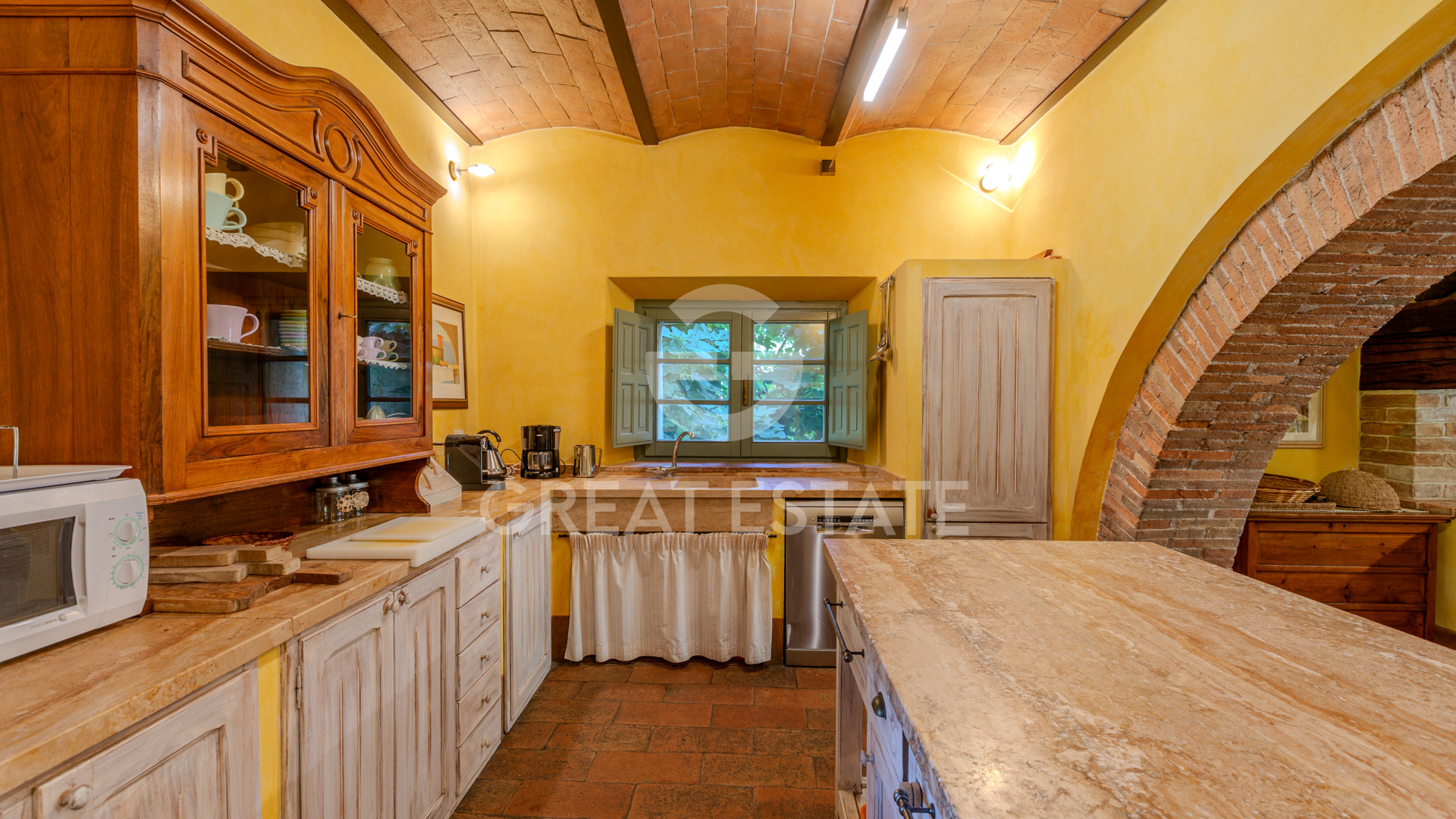 The interior spaces are characterized by optimal rationality and functionality, with a layout that enhances the flow and livability of the rooms. The handmade terracotta floors, emblematic of local tradition, have been carefully restored, featuring smooth, leveled surfaces, while the ceilings partially reveal characteristic wooden beams with terracotta tiles and partly showcase brick vaults with exposed brickwork—elements that create a warm and inviting ambiance.
