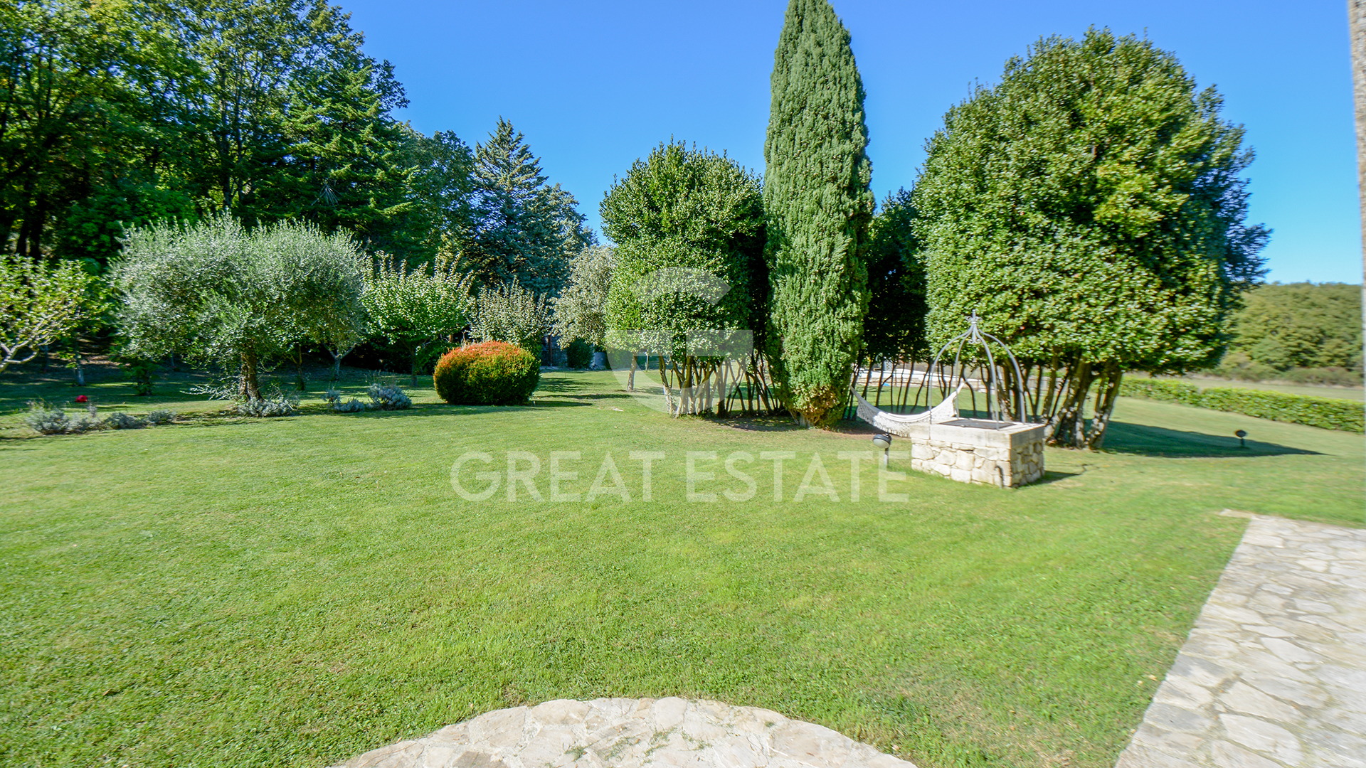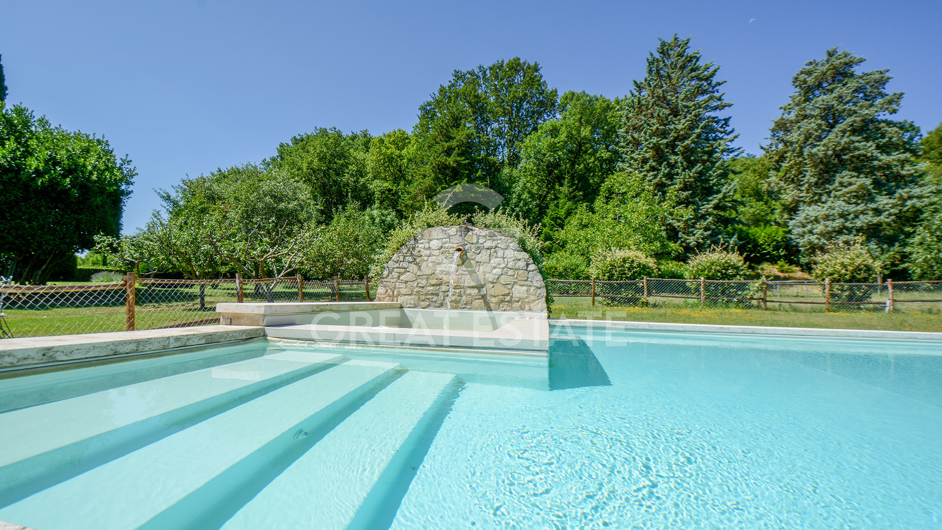 The landscaped garden is a serene paradise designed for peaceful moments and social gatherings: blooming courtyards, shaded pergolas, secluded corners, and open views of the surrounding countryside. The pool area, styled like an old fountain basin with a travertine edge, complete with a Jacuzzi and pergola, invites total relaxation.