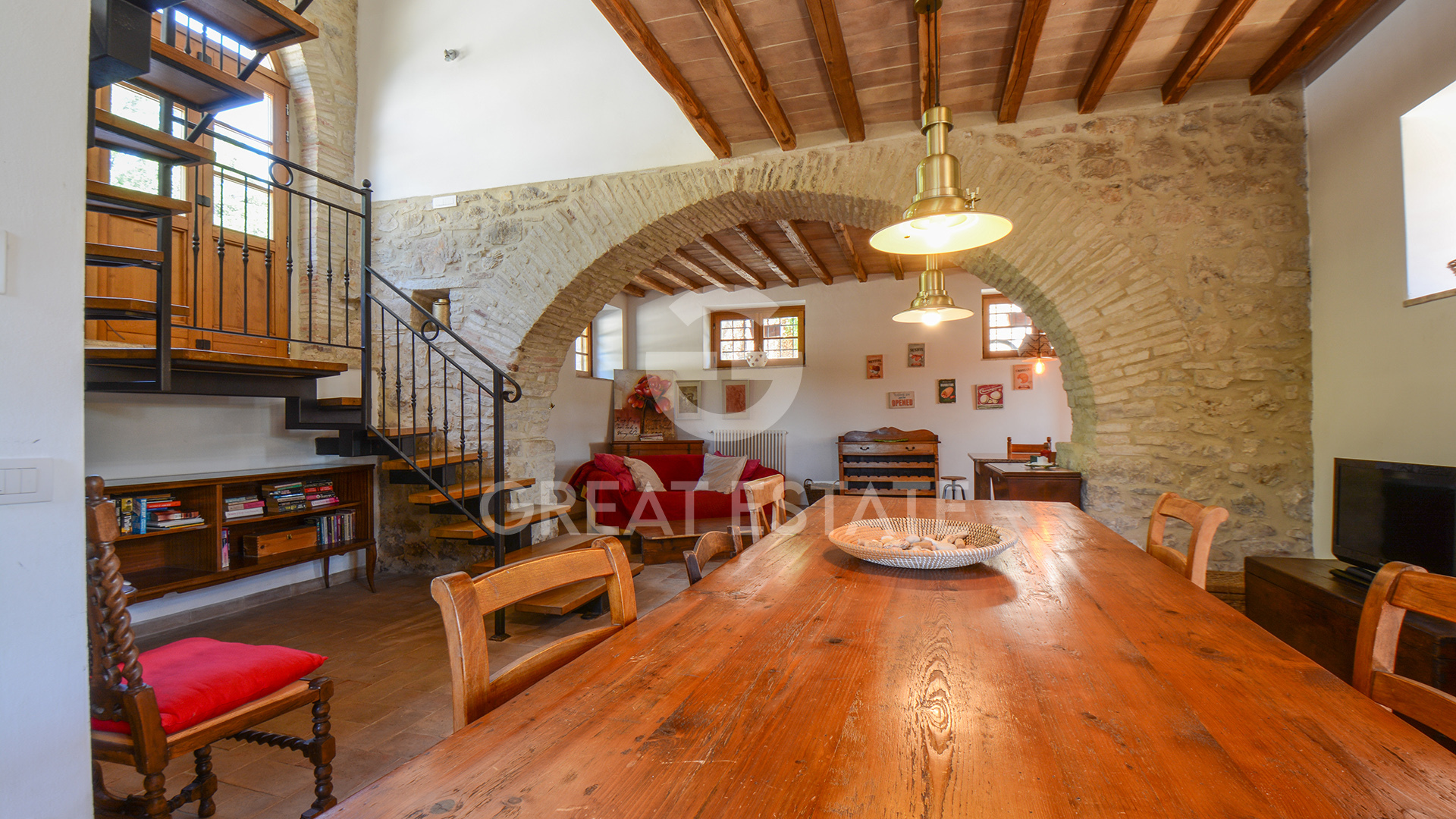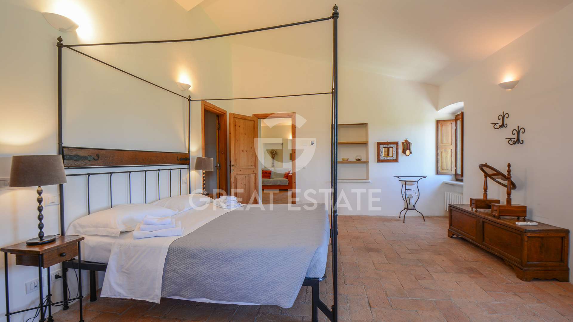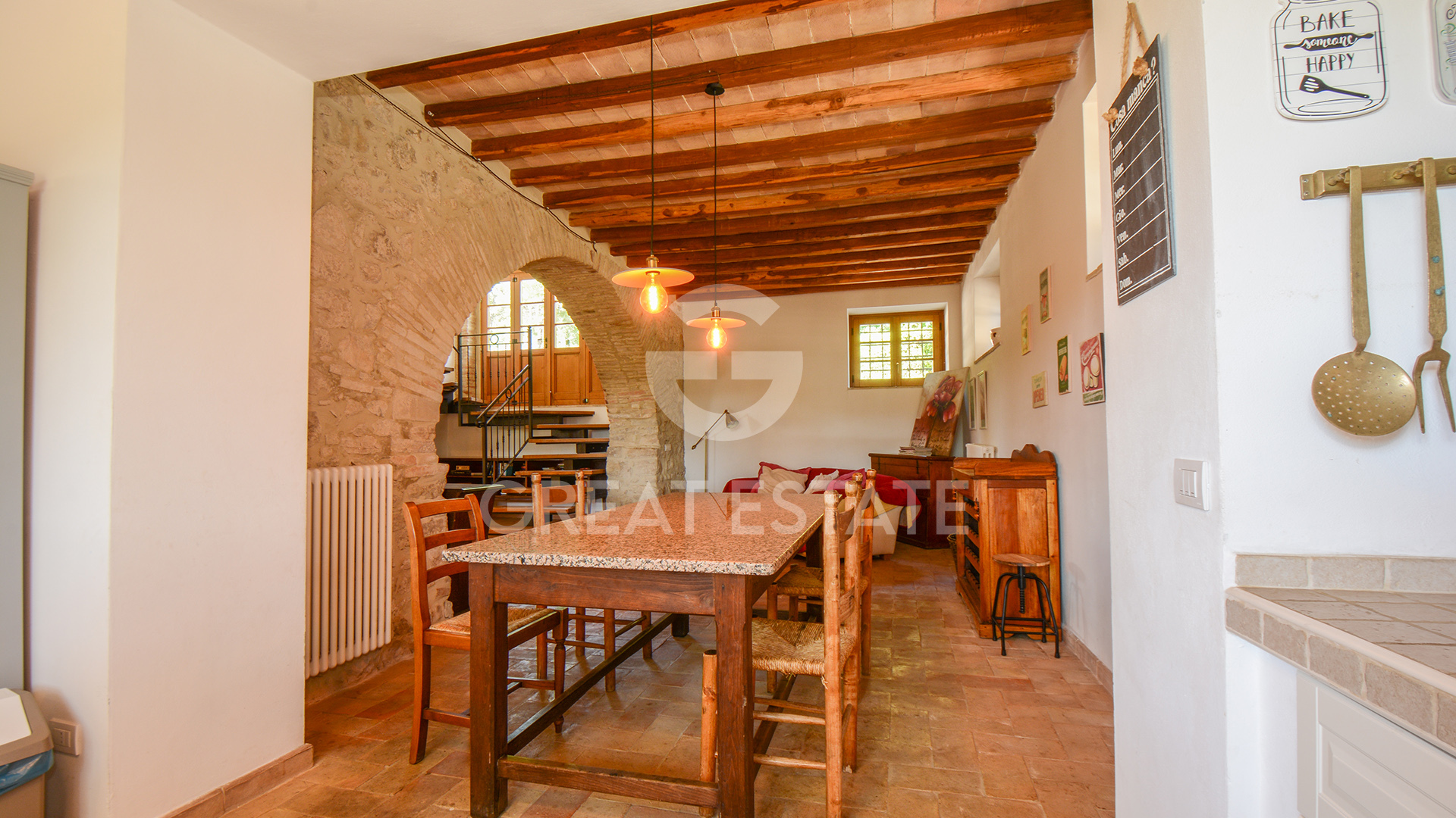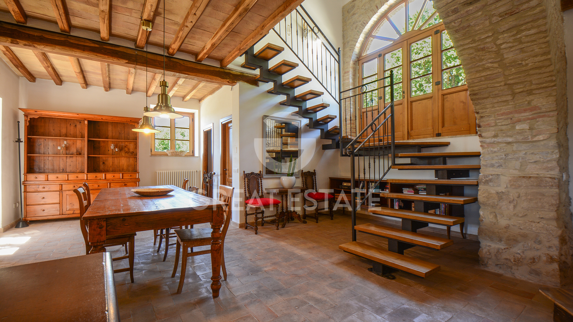 The property, meticulously restored in 2011, preserves its historic essence intact, enhanced by top-quality finishes that marry classical materials with refined and functional design. The interiors are distinguished by exceptional rationality and fluidity of space, ensuring comfort and practicality in every room. The well-preserved antique terracotta floors harmonize seamlessly with exposed beam ceilings and brick vaults, while the walls feature a luxurious plaster finish, smoothed and painted in light tones that amplify the natural brightness throughout the spaces.