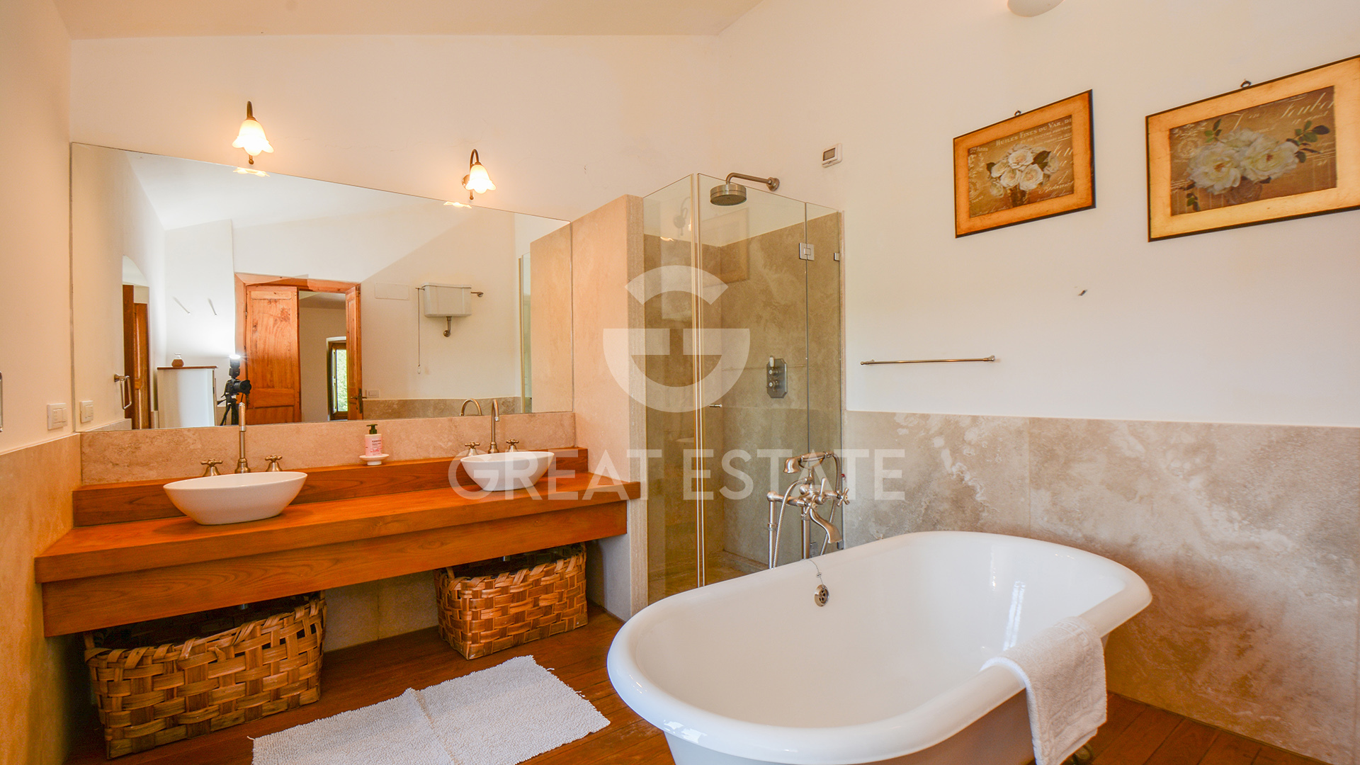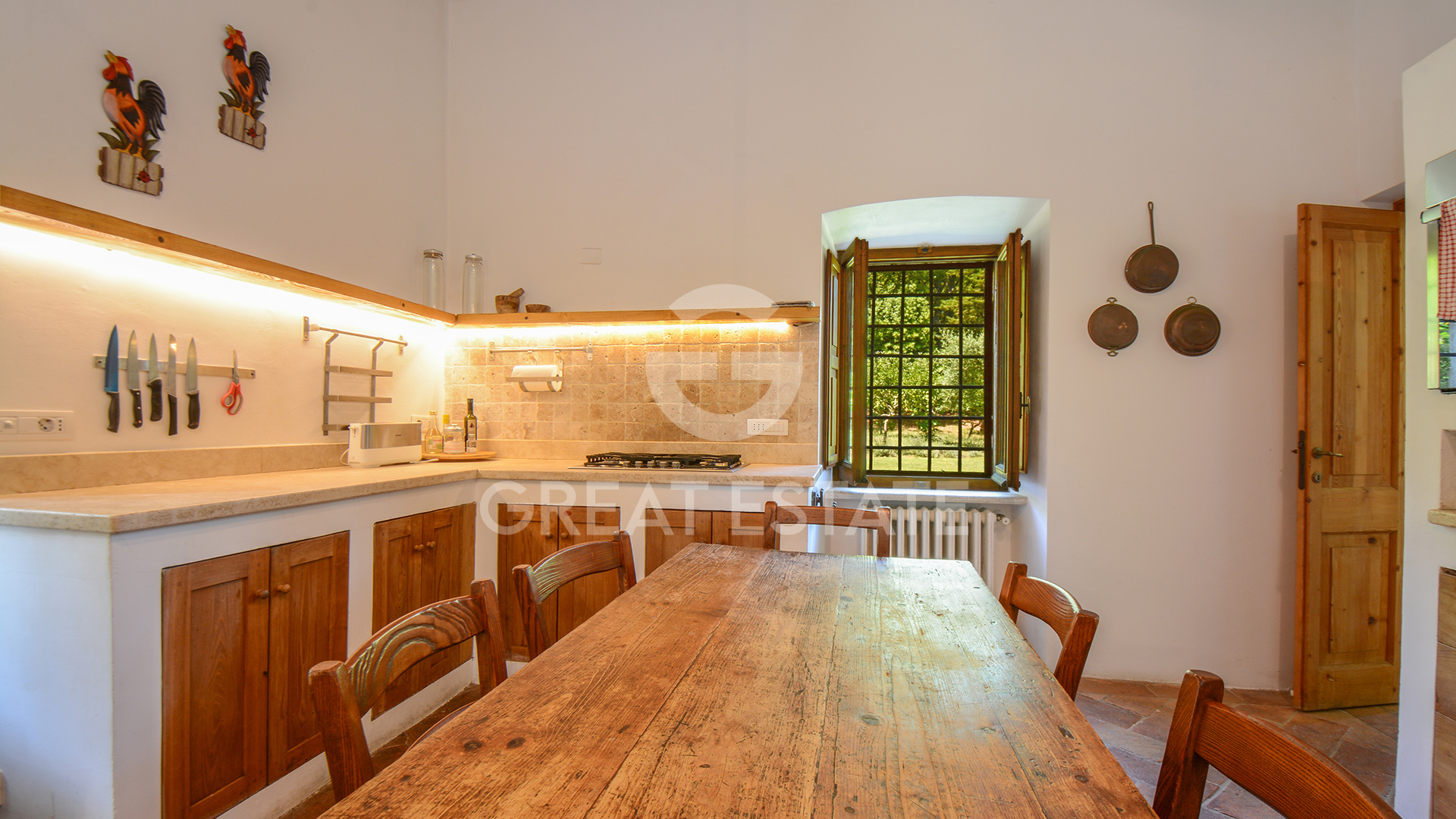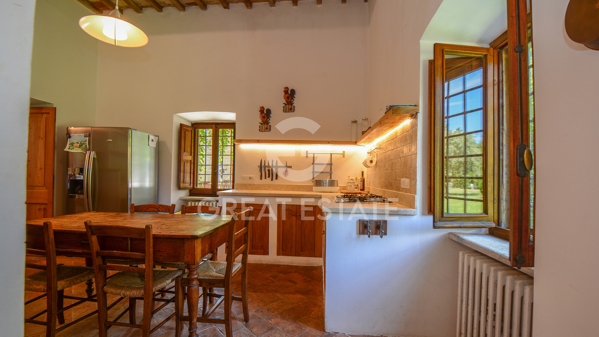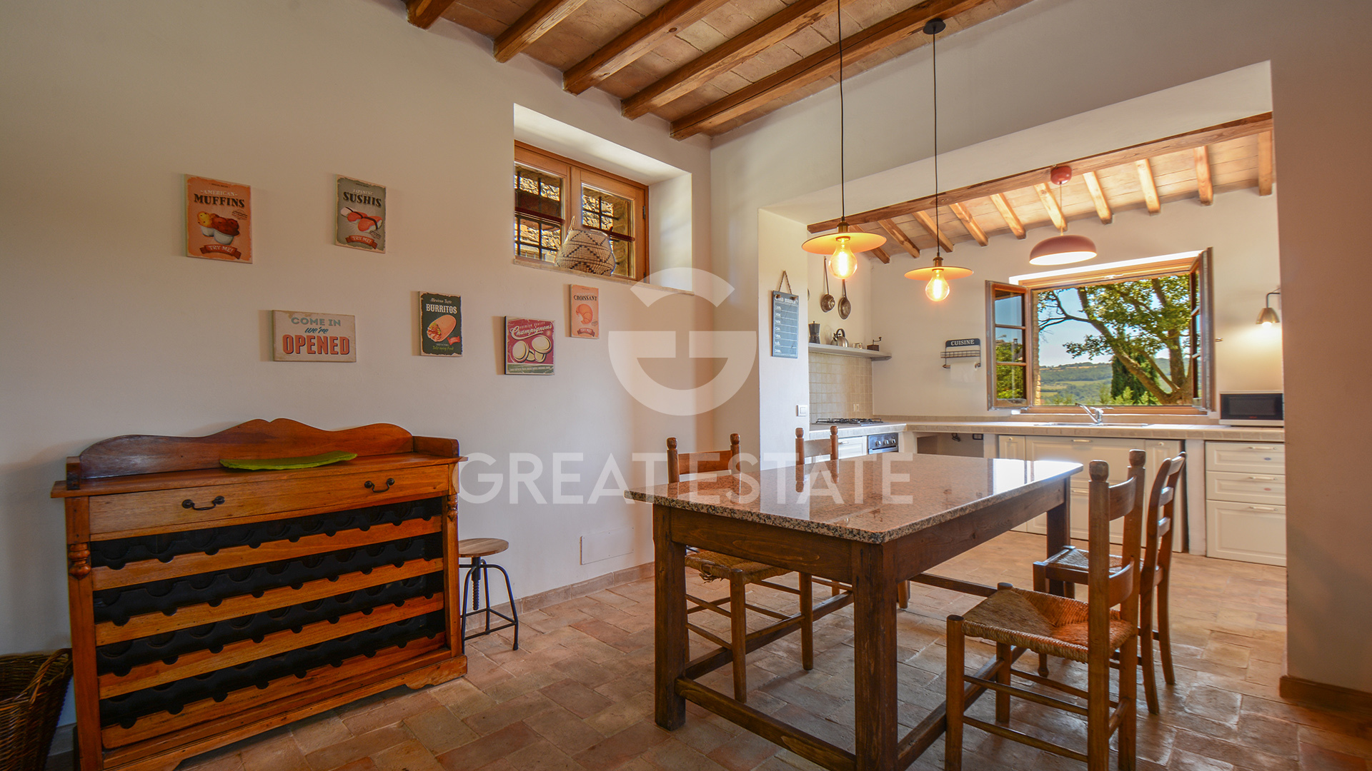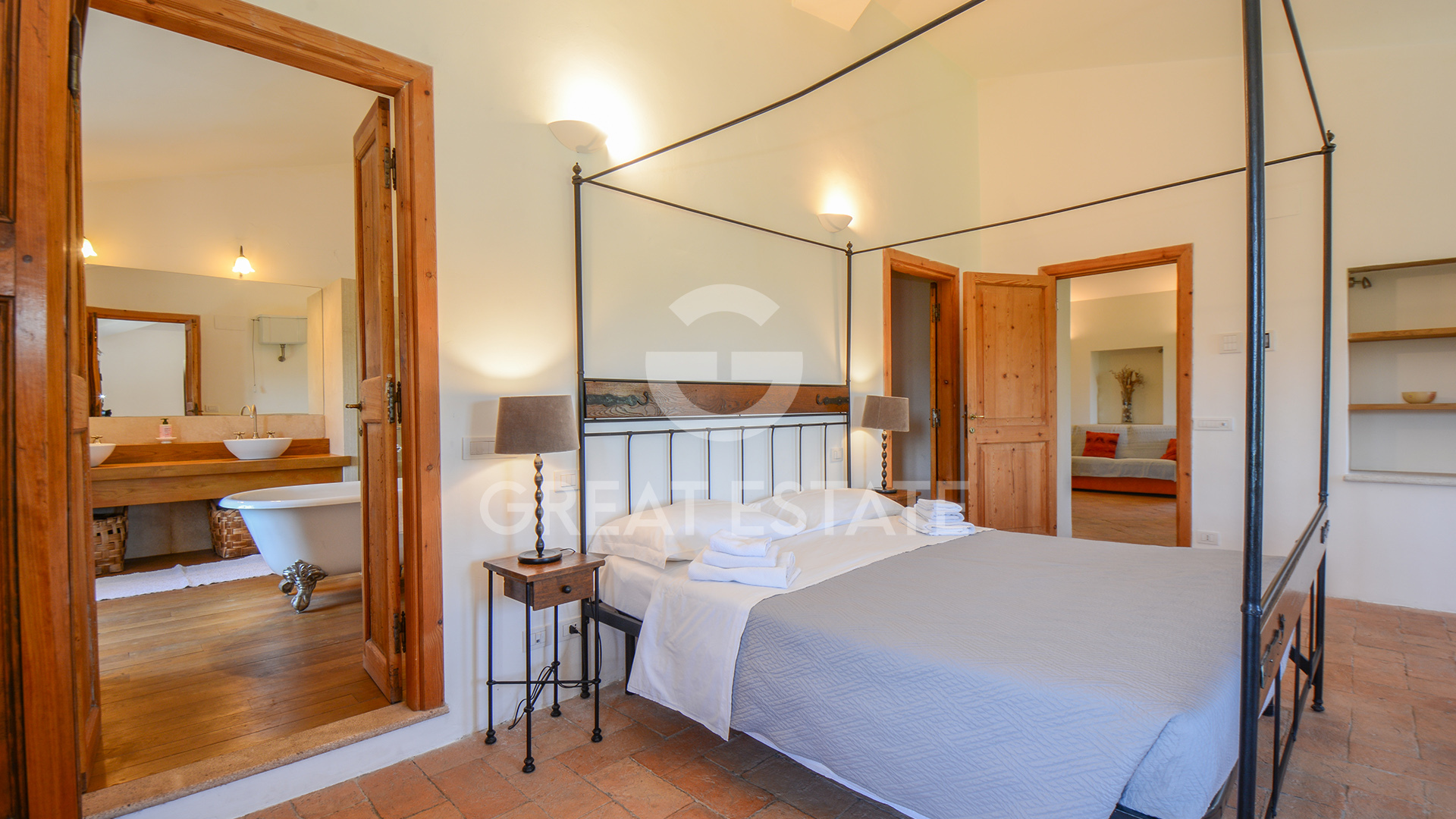 The property, meticulously restored in 2011, preserves its historic essence intact, enhanced by top-quality finishes that marry classical materials with refined and functional design. The interiors are distinguished by exceptional rationality and fluidity of space, ensuring comfort and practicality in every room. The well-preserved antique terracotta floors harmonize seamlessly with exposed beam ceilings and brick vaults, while the walls feature a luxurious plaster finish, smoothed and painted in light tones that amplify the natural brightness throughout the spaces.