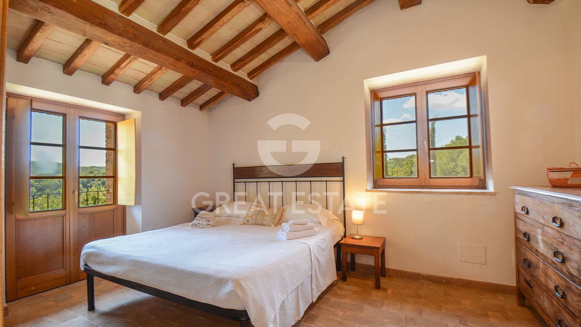 The interior spaces exude timeless charm: the ground floor of the main residence, once used as a stable, is now a bright and expansive area with high ceilings, exposed beams, stone arches, and a grand fireplace as its centerpiece. On the first floor, a cozy living room with a fireplace and three bedrooms with en-suite bathrooms provide warmth and privacy. The guesthouse boasts an inviting open-plan living area with kitchen and a terrace commanding breathtaking panoramic views.