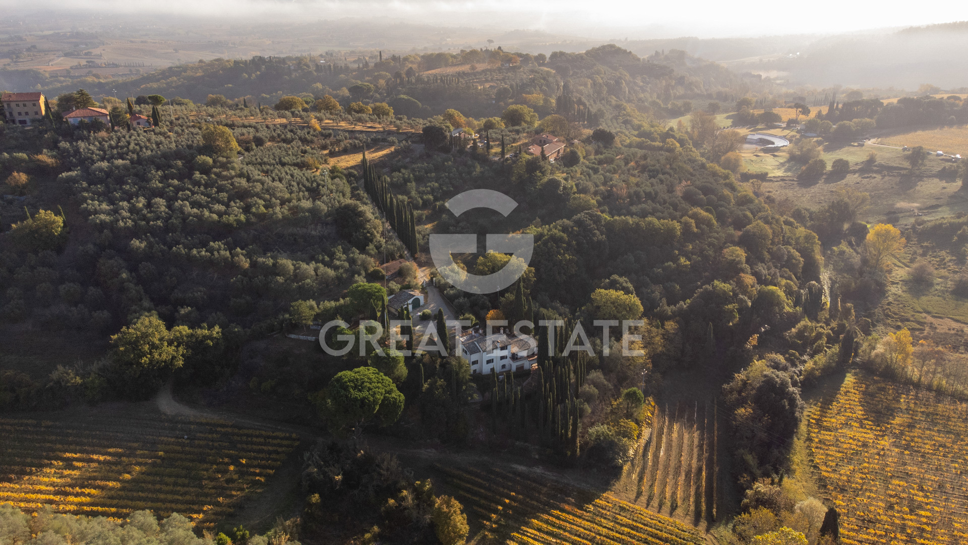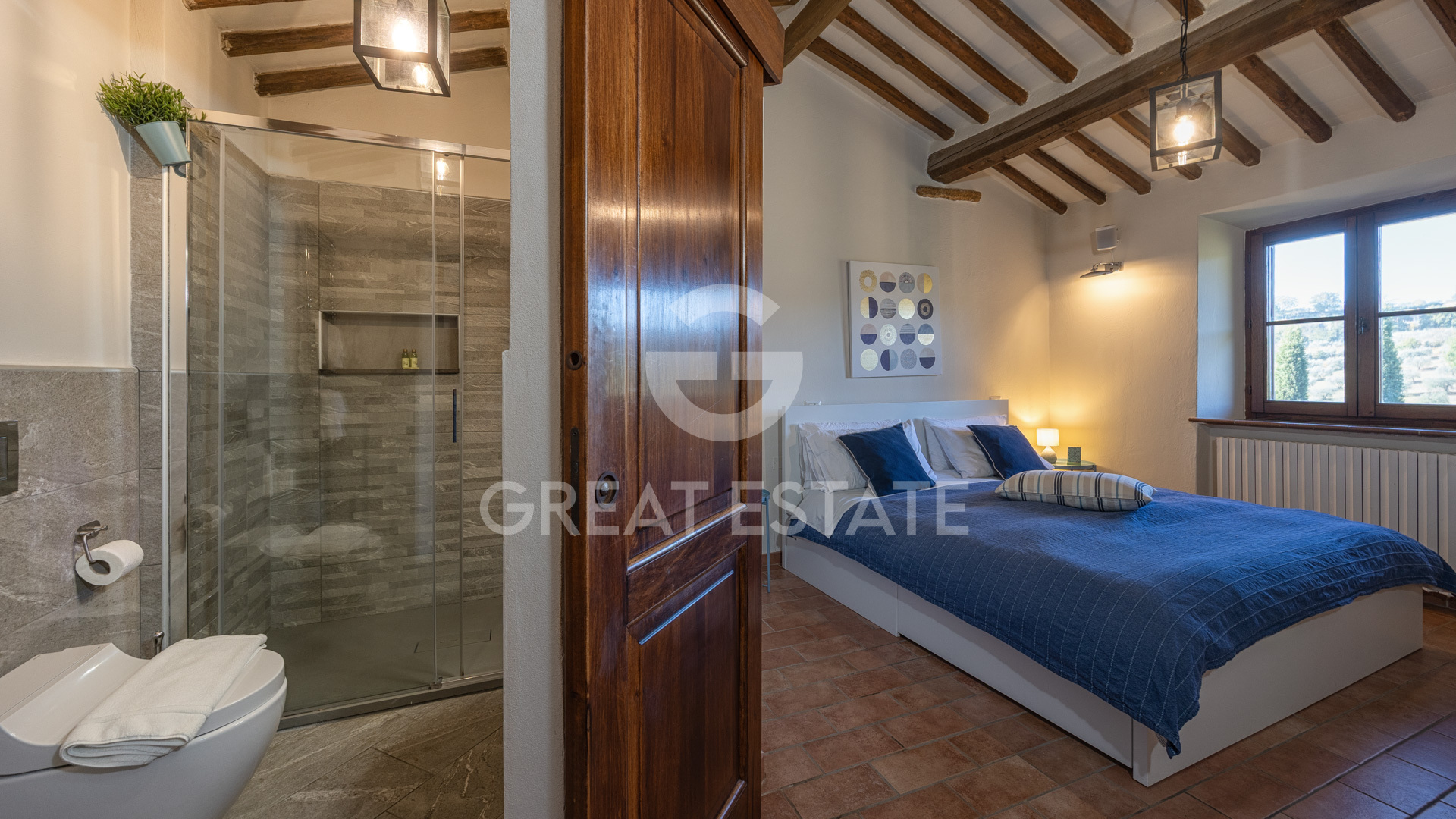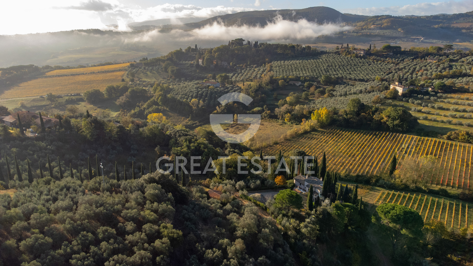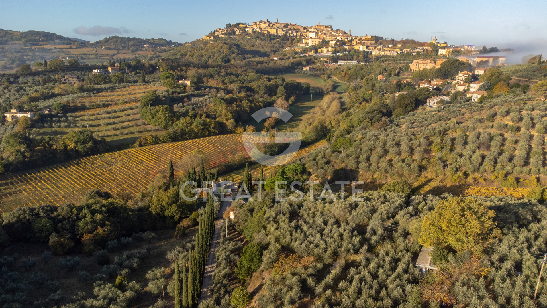For sale, a stunning villa just steps from the renowned tourist destination of Montepulciano, featuring a total of 6 bedrooms and 7 bathrooms, set on approximately 3,500 sqm of land with 40 producing olive trees.