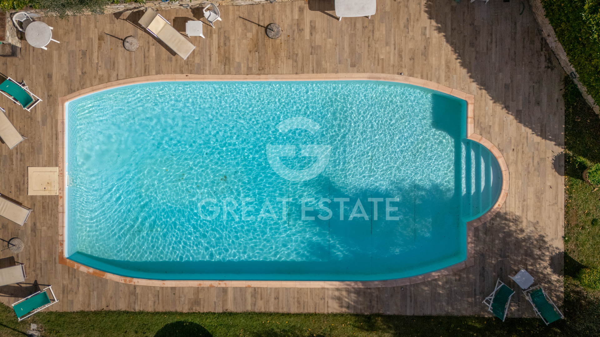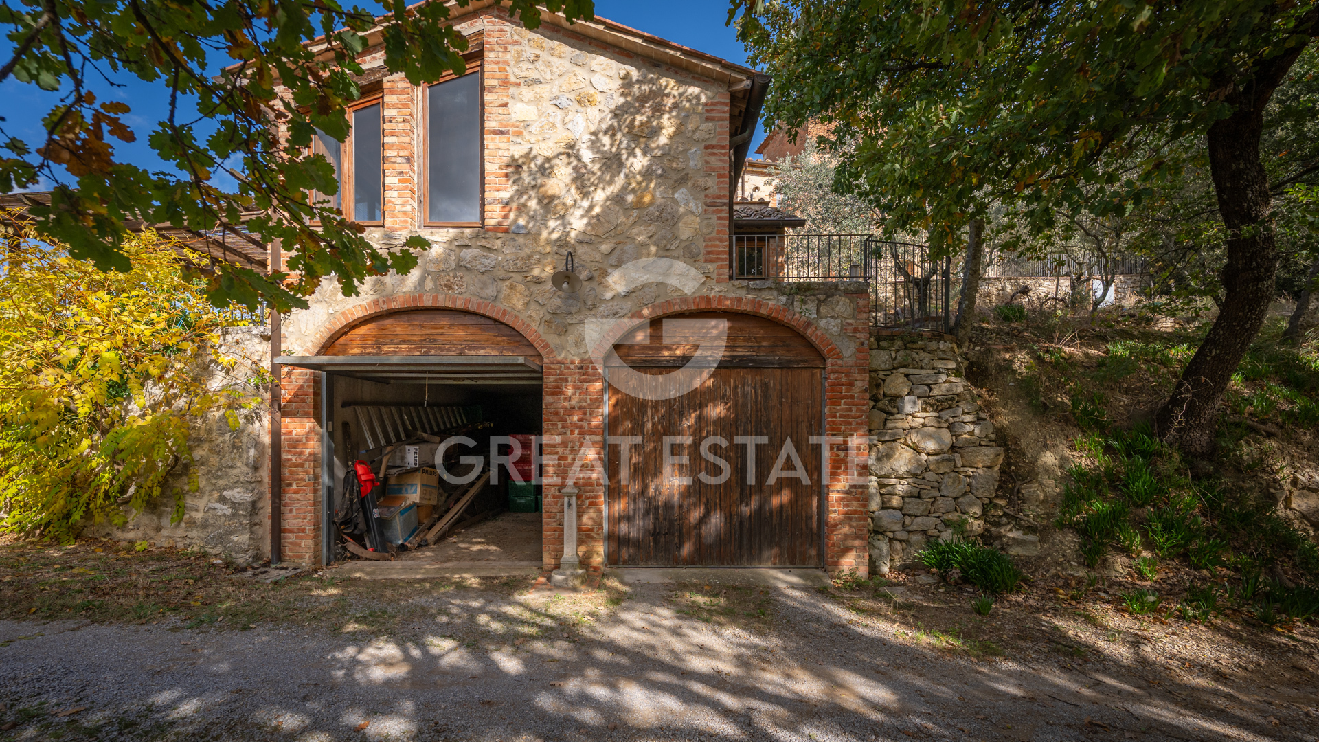 Access is via a short and picturesque country road leading to the electric entrance gate. A large natural terrace facing south welcomes guests and leads to the main farmhouse and pool area, offering a wonderful perspective of the surrounding landscape and ideal spaces for outdoor living, dining, or relaxing at sunset.