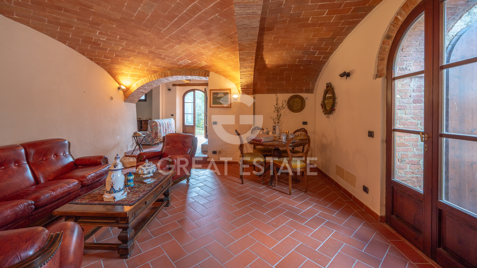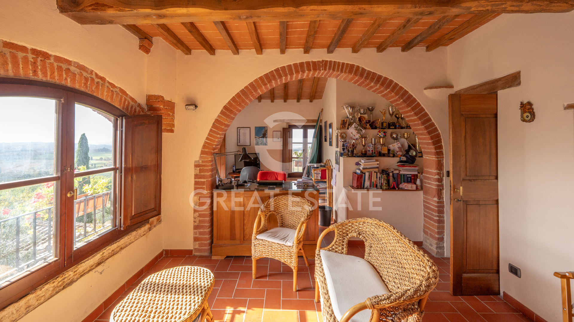 The property enjoys a splendid open view of the surrounding hills and features the typical characteristics of Tuscan architecture, with exposed wooden beams, terracotta brick ceilings, and terracotta floors, which provide warmth and authenticity to the spaces.