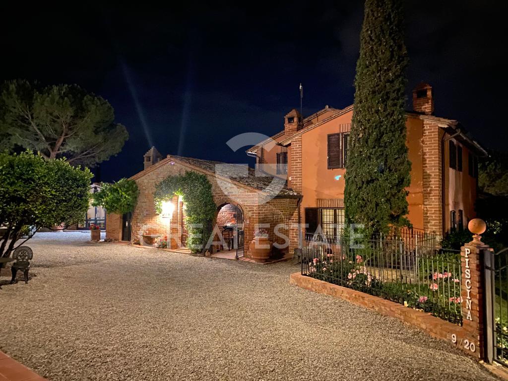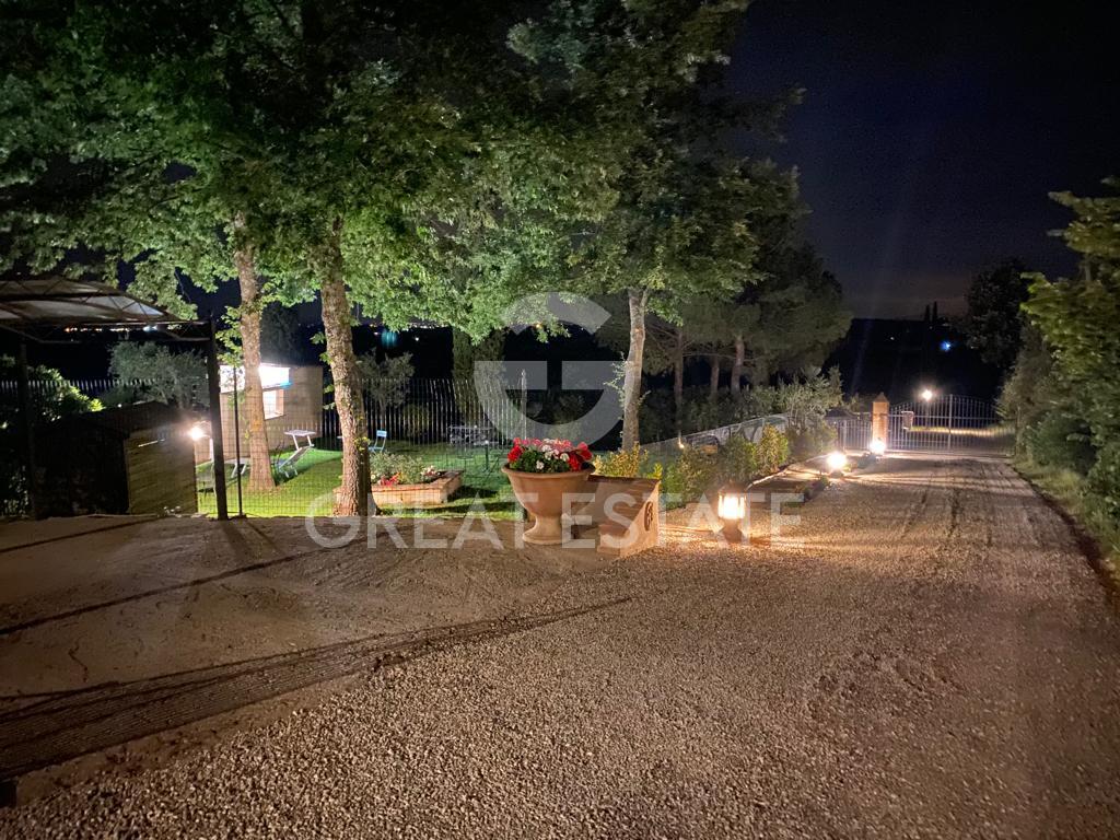 The land, featuring olive groves and an outdoor swimming pool, completes the offering, creating an ideal setting for relaxation, outdoor events, or small-scale agricultural production.