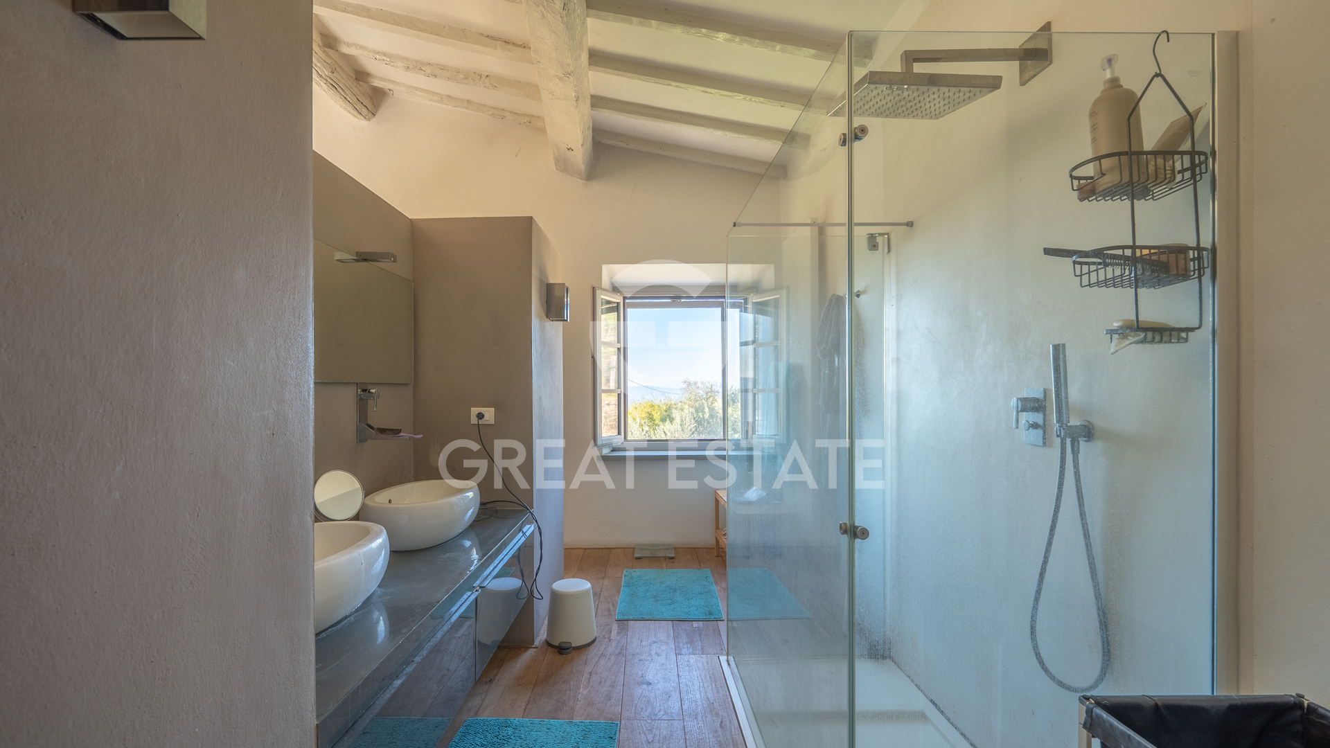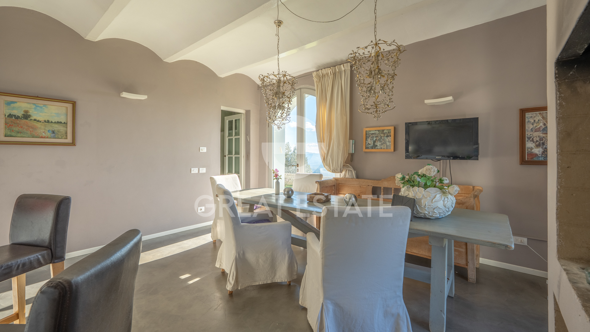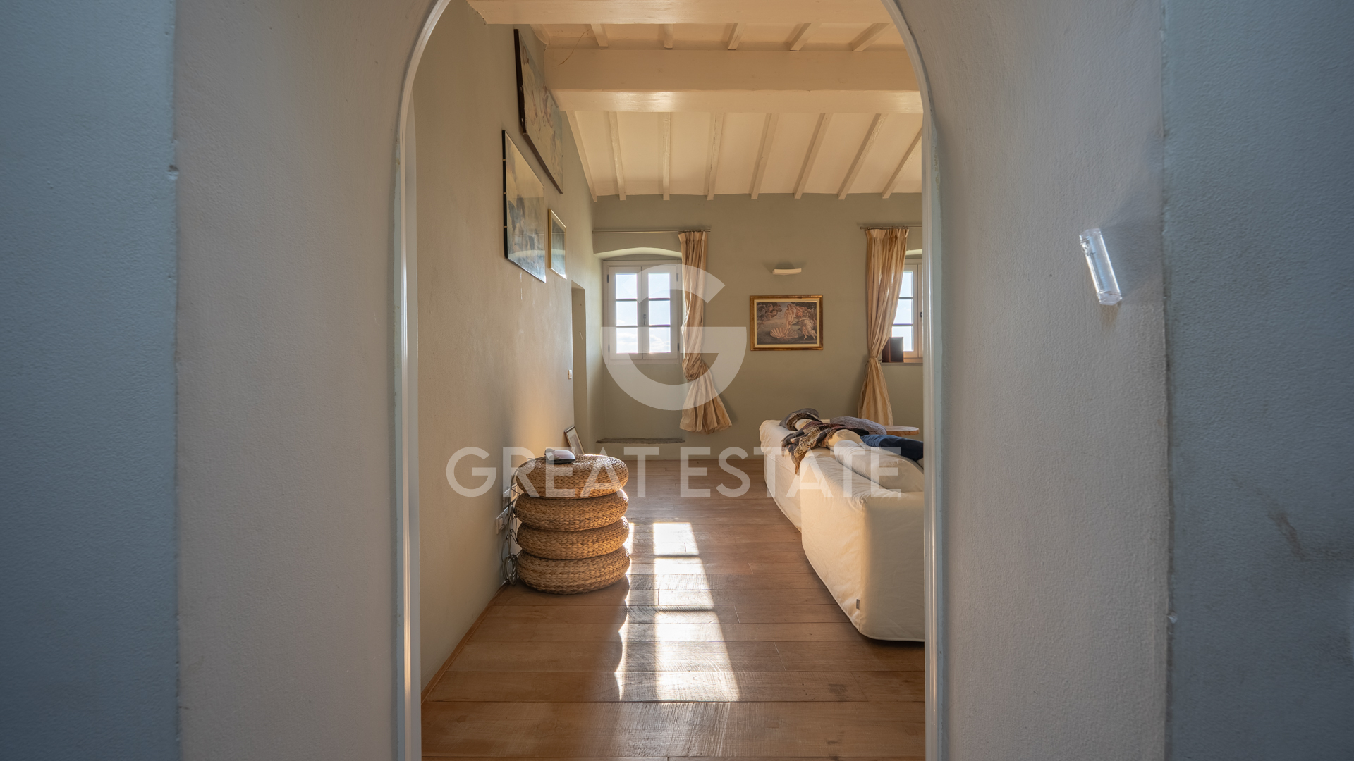 The villa, completely renovated with high-quality finishes, was purchased by the current owners in 2022. During the restoration, typical Tuscan villa features were preserved, such as wooden beams, which were repainted, and stone fireplaces, restored to their former beauty. All the windows of the property are also fitted with decorative glazing film.