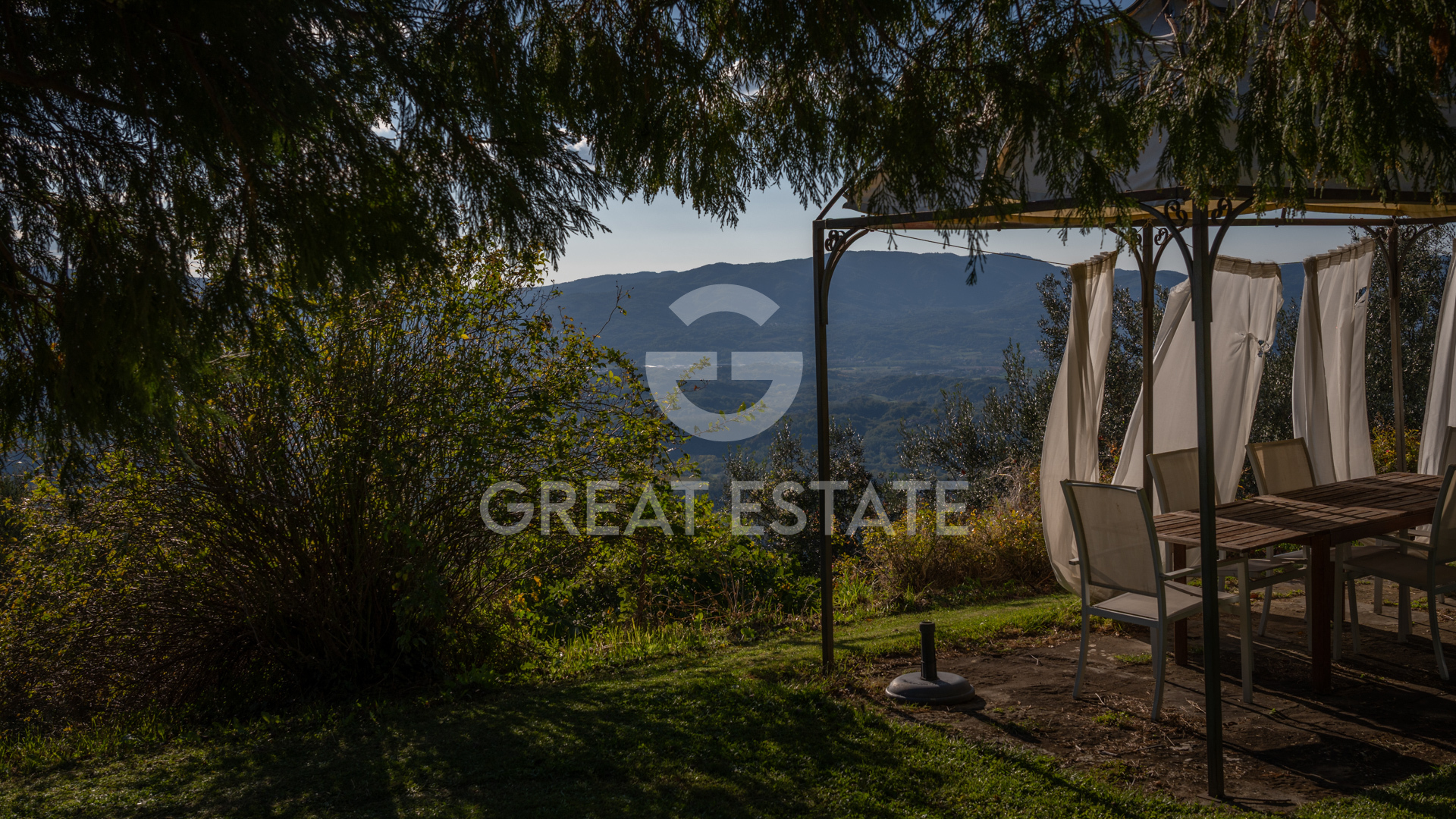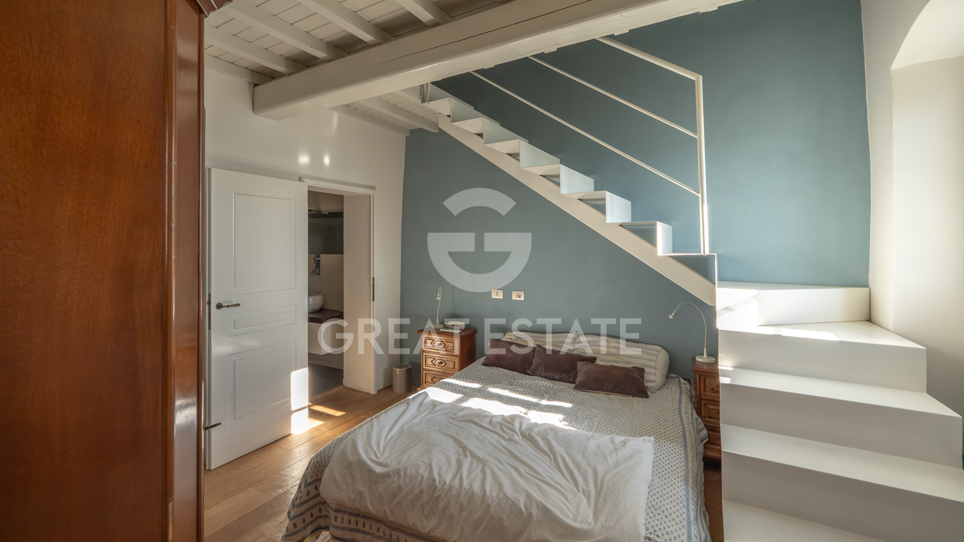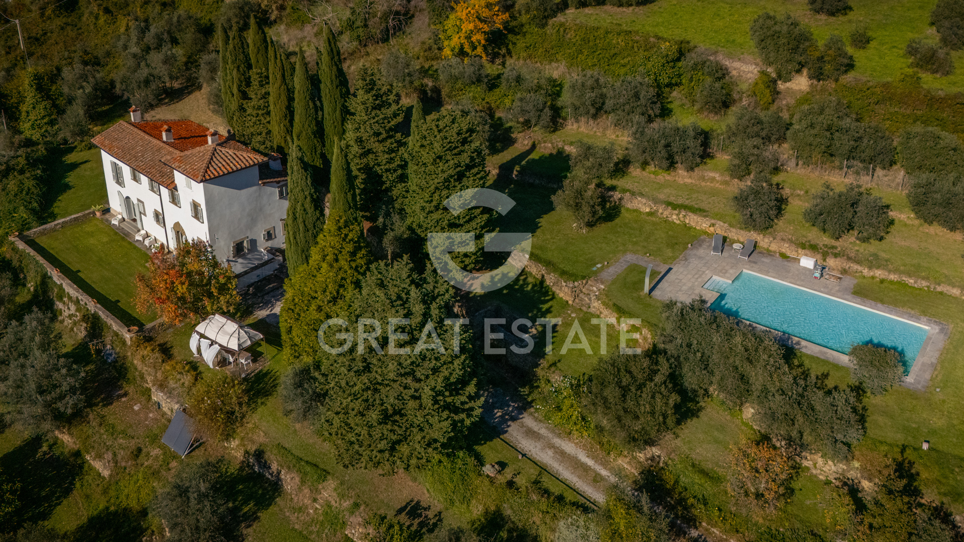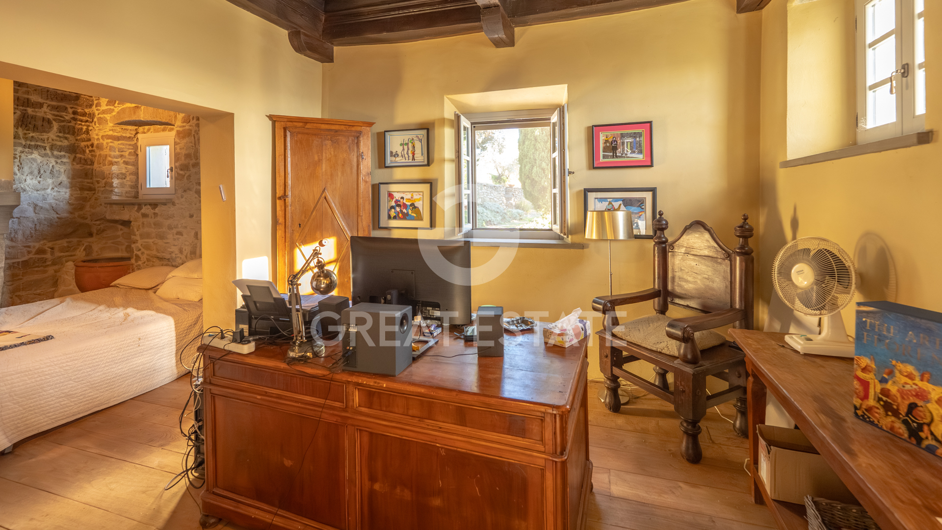 The villa, completely renovated with high-quality finishes, was purchased by the current owners in 2022. During the restoration, typical Tuscan villa features were preserved, such as wooden beams, which were repainted, and stone fireplaces, restored to their former beauty. All the windows of the property are also fitted with decorative glazing film.
