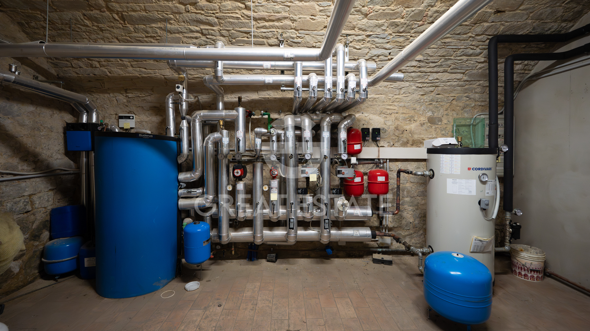 The villa is equipped with all utilities. Water supply is provided both by the public aqueduct and a private well. The underfloor heating system is powered by LPG. The property also includes a solar thermal system for hot water, air conditioning, an alarm system, and an electric gate.