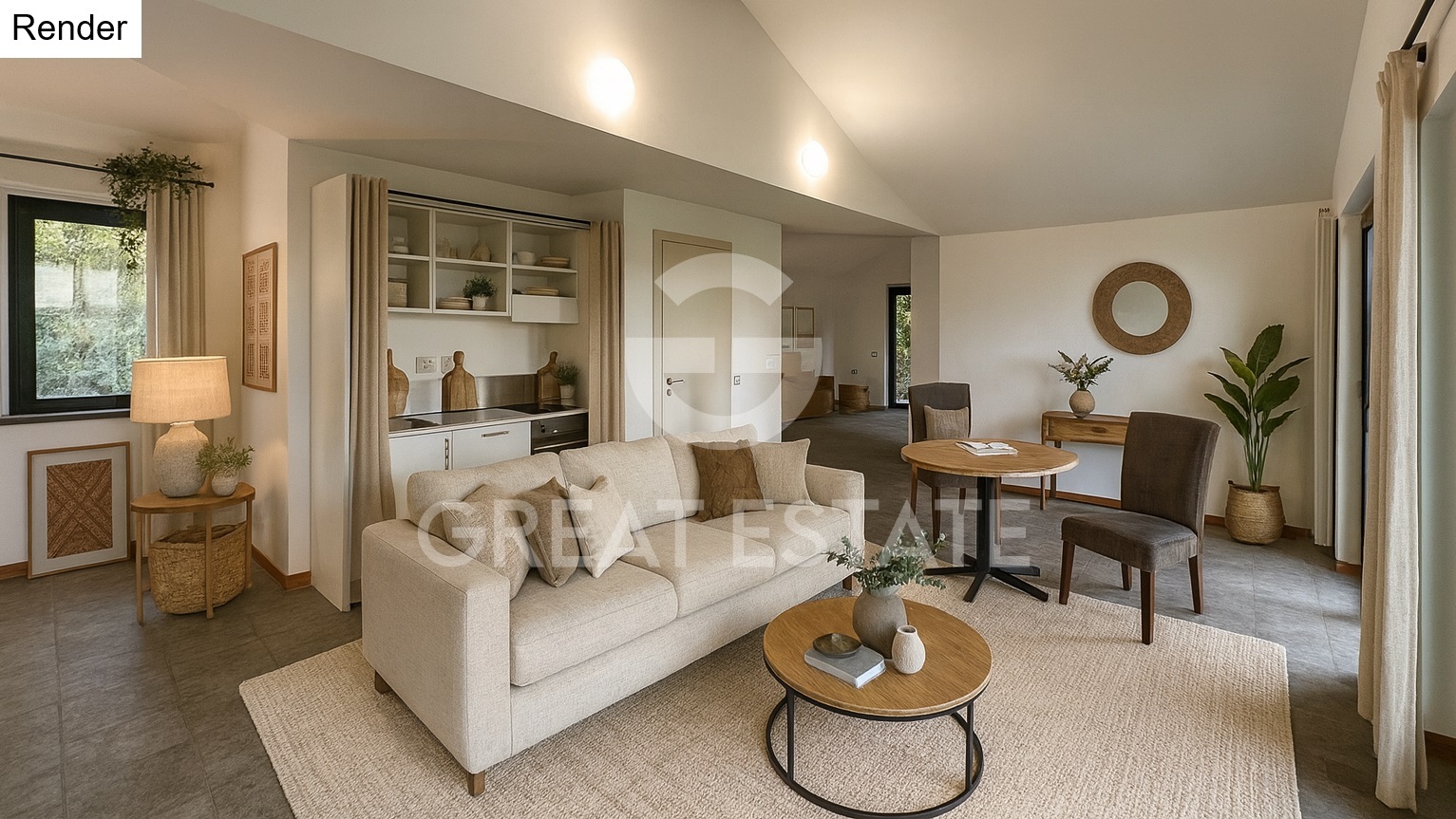 The layout follows a modern, open-concept design: in addition to a separate bedroom, the villa is conceived as an open space with seamless transitions between the living room, kitchen, and dining area. Large windows integrate light and nature as essential elements of the interiors. The lake is visible from almost every corner—both calming and inspiring.