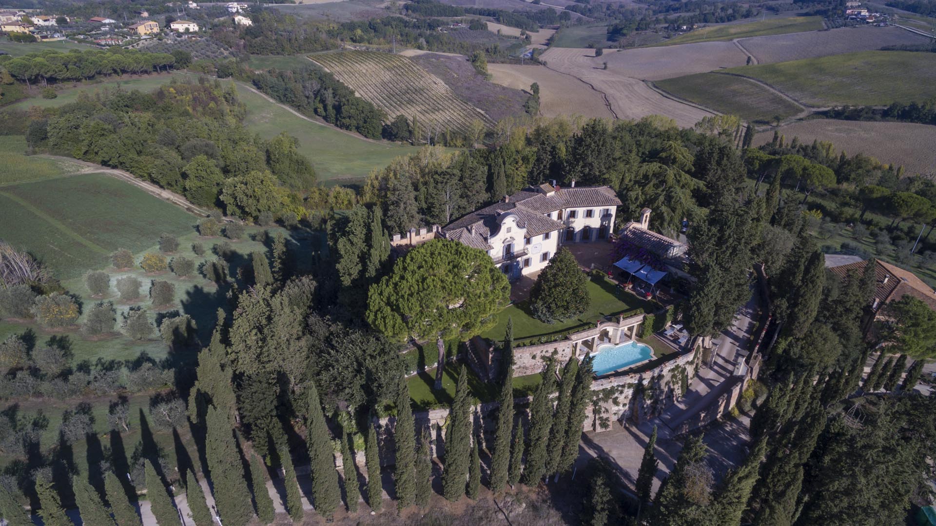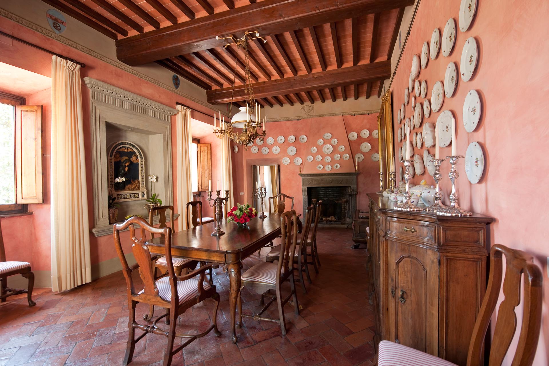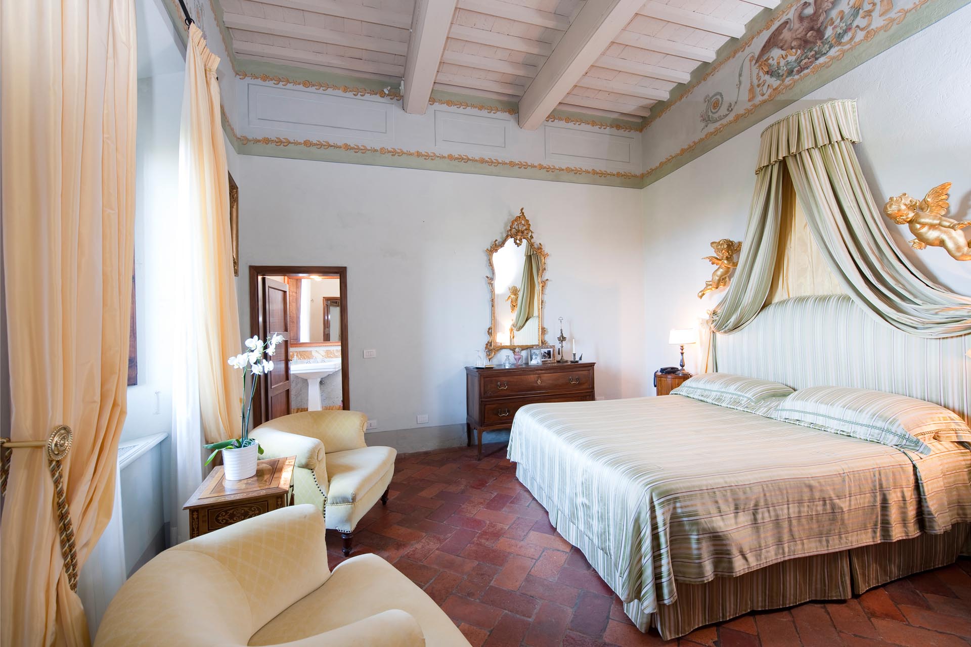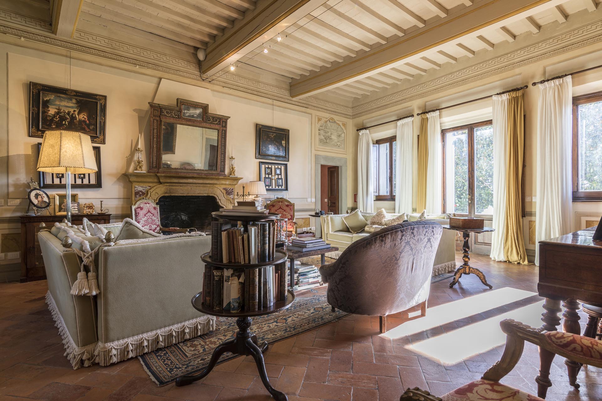 On the sweeping grounds there’s a pool surrounded by a loggia, a solarium and plenty of space for all guests. Hidden away, yet very close to all the top locations of Tuscany, this estate offers six bedrooms decorated in elegant style with colour washed walls in pale coloured shades and trompe l’oeil, custom made fabrics and several bespoke furnishing by local Italian artisans.
